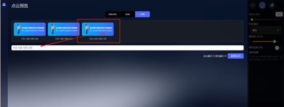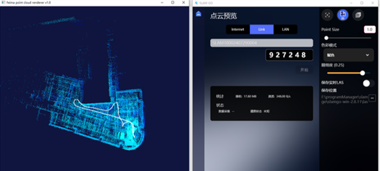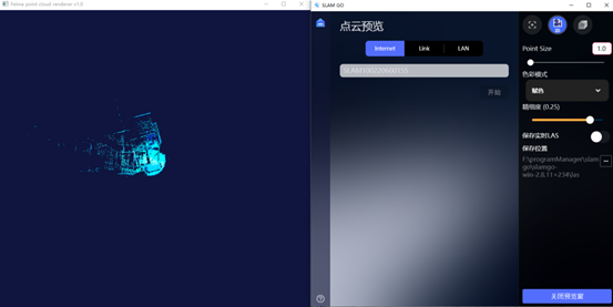 步骤三:在 PC 端打开 SLAM GO WiN 软件,切换「LAN」模式,选择局域网中发现的设备(或输入设备 IP),点击「链接」按钮,将弹出预览窗口,并显示实时点云。