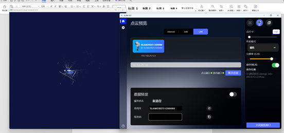 步骤四:在 PC 端打开 SLAM GO WiN 软件,切换「Internet」模式,输入设备序列号,点击「确认」按钮,将弹出预览窗口,并显示实时点云。