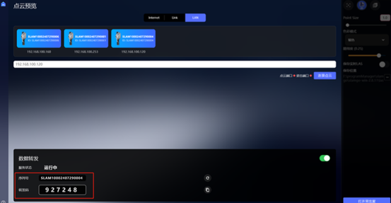 步骤四:在同一局域网的 PC 端 B 的「Link」界面输入设备序列号和转发码,点击「开始」按钮,将弹出预览窗口,并显示实时点云。
