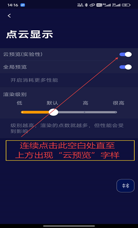 步骤二:在 APP「点云显示」设置中,打开「点云预览」功能;