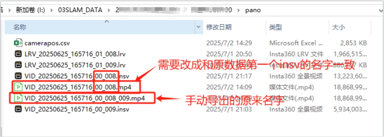 3.用Insta360 Studio工具手动导出后未改名称:需要重命名手动导出的mp4的文件名与原始数据的第一个insv文件名一致。