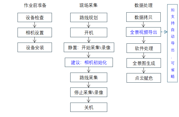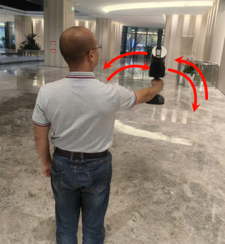c) 静置完成后,从设备正后方,用右手拿起设备,右手持设备左右晃动一次,保证相机更好的完成初始化。(设备姿态与位置需要有明显的变化,右手持设备是为了右侧的基准相机遮挡更少,采集员不出现在右侧相机照片内,应站在设备左侧,有助于设备处理算法初始化)。
