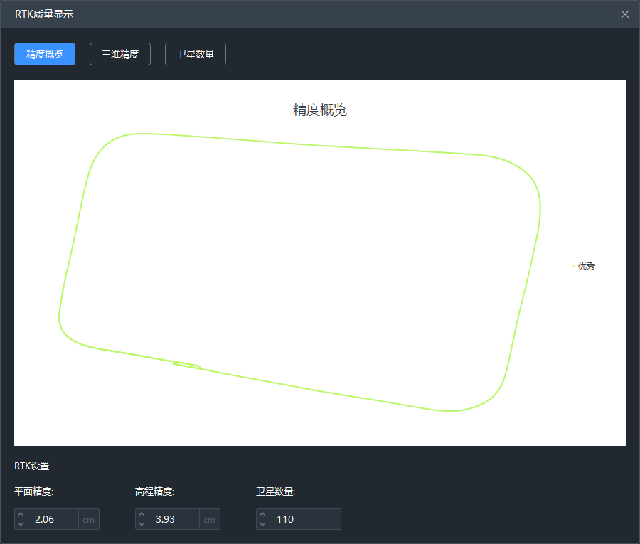 RTK质量显示:显示RTK原始质量显示,包括精度概览图、三维精度、卫星数据。也可通过RTK设置的平面精度、高程精度、卫星数量数值调整联动显示。