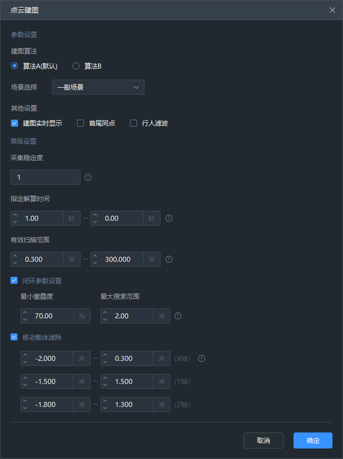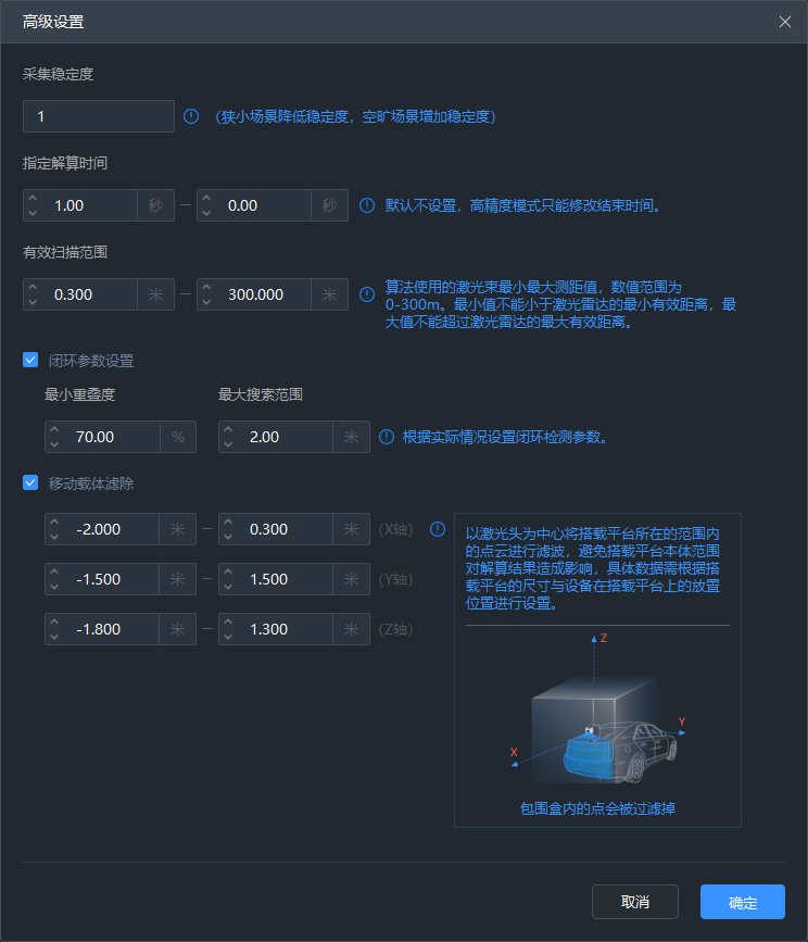 高级设置:针对建图相关参数的设置按钮,可以选择高级设置参数,包含采集稳定度、指定解算时间、有效扫描范围、闭环参数设置、移动载体滤波设置。