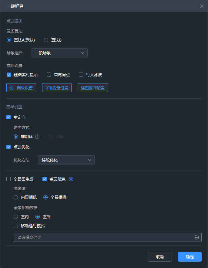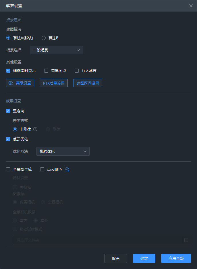 【场景选择】可选择一般场景、地铁场景,默认一般场景,选择地铁场景即可切换至地铁建图算法,提高地铁场景建图效果及精度。