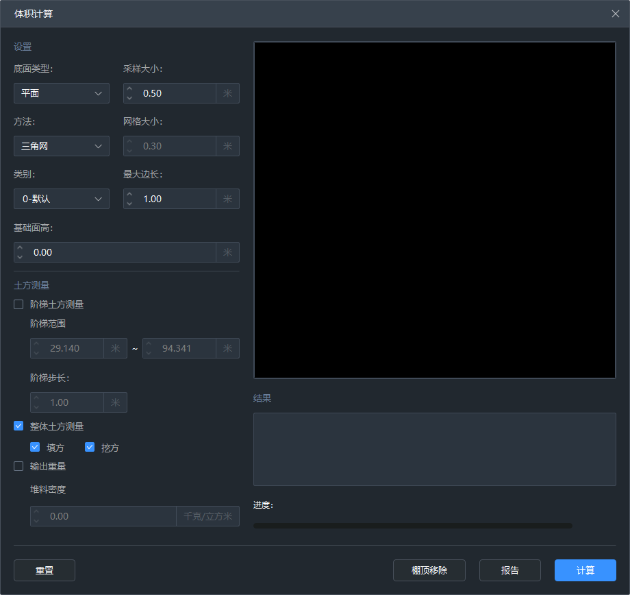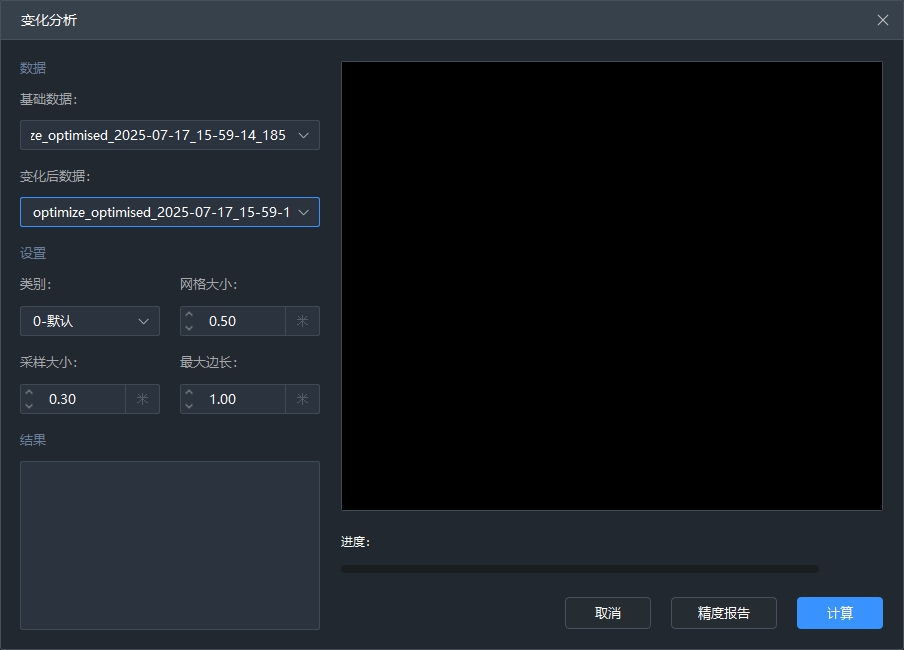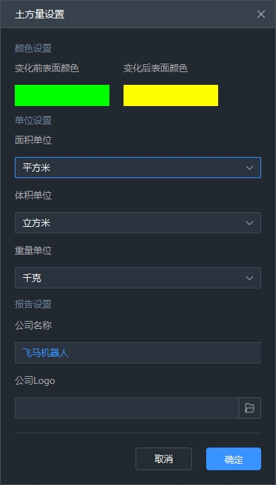 主要用于土方量模块-变化分析变化前后的表面颜色进行设置,体积计算、变化分析的计算单位、输出报告相关参数进行设置,包含点云颜色设置,计算面积、体积、重量单位设置,输出报告的公司名称、公司Logo设置。