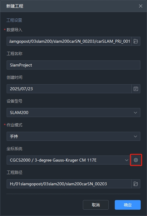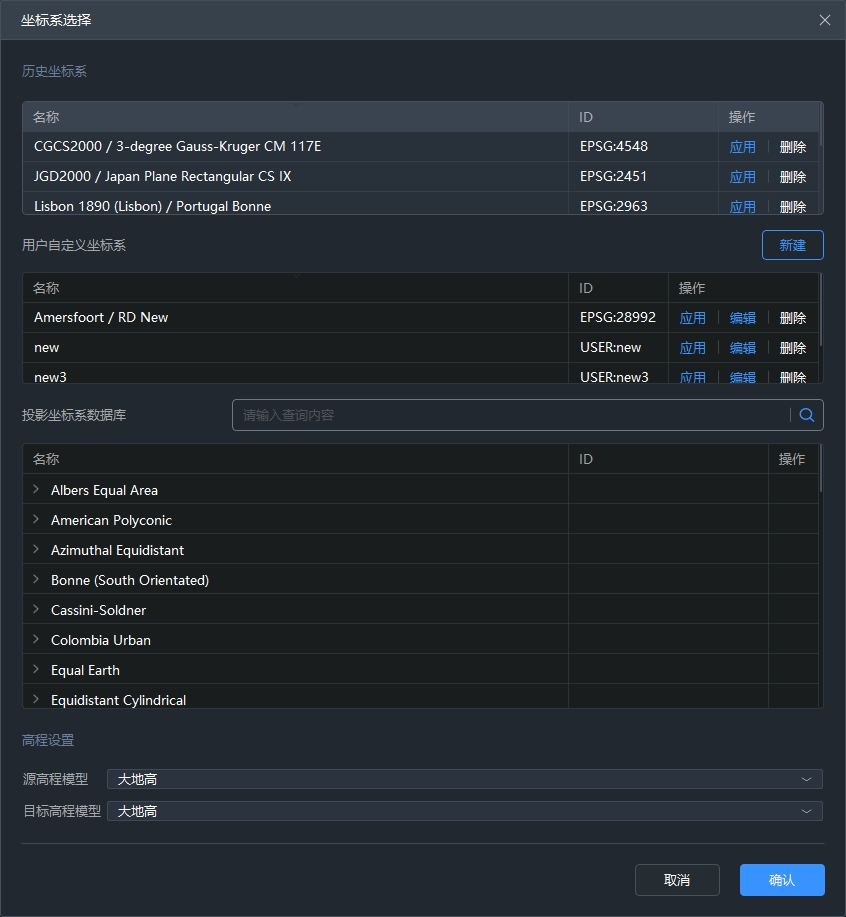 【坐标系统】:如果数据中含有GNSS数据并有效时,才会出现坐标系统设置相关功能,可使用自动识别坐标系,也可通过右侧齿轮按钮打开坐标系选择页面进行坐标系选择。