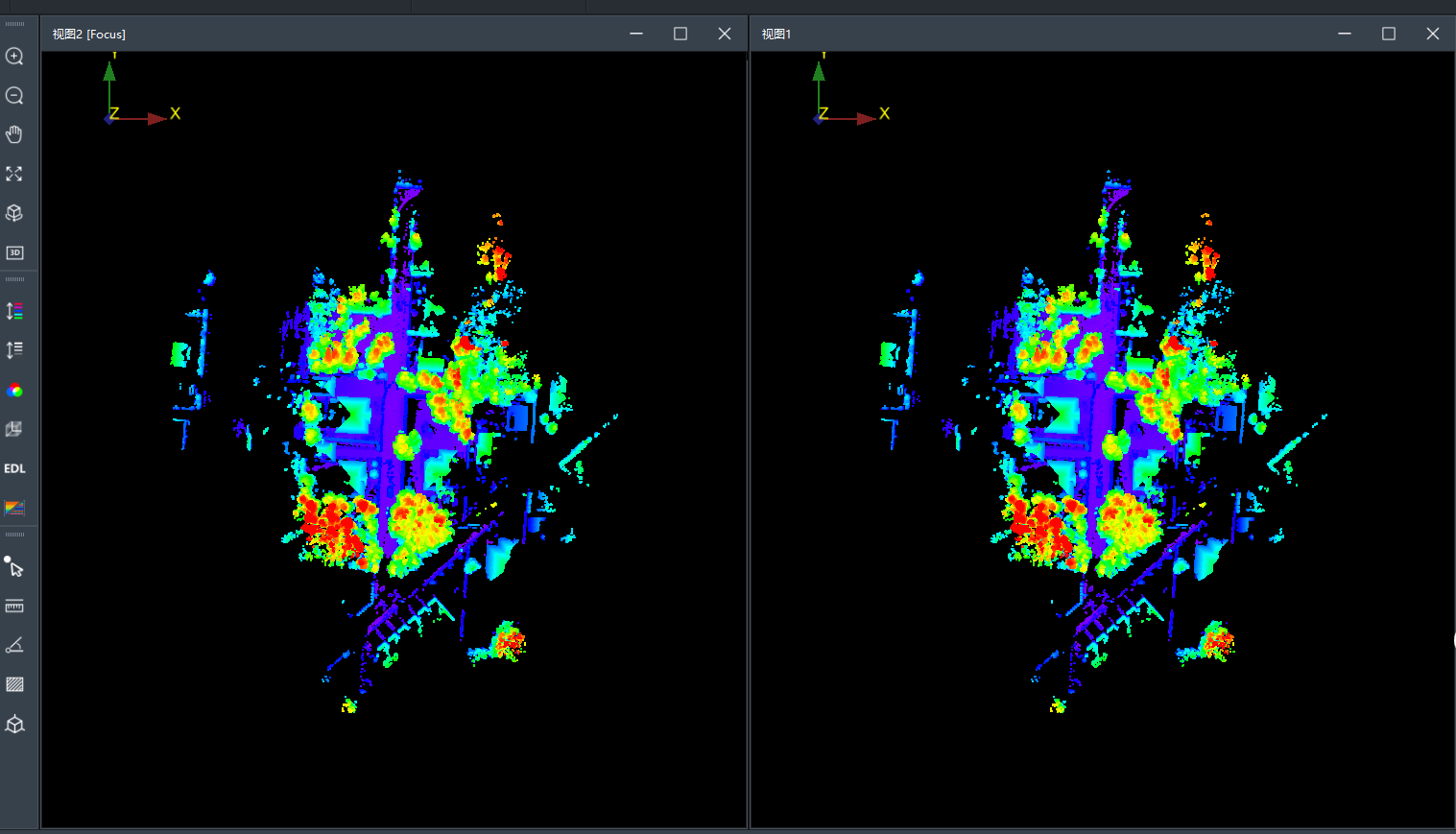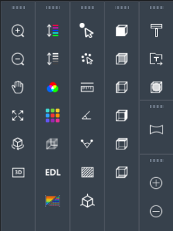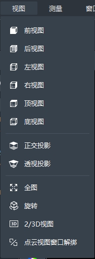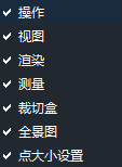 快捷工具条位于视图窗口左、右两边,包括操作、视图、渲染、测量、裁切盒、全景图、点大小设置等工具条。可通过鼠标左键拖动各组件位置,也可通过鼠标右键控制各工具条组件的显隐状态。