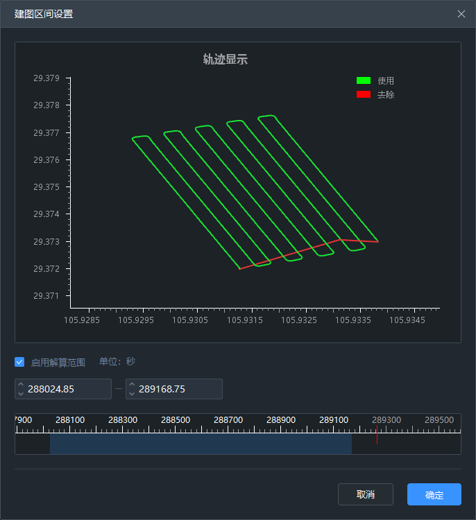 建图区间设置:有GNSS的数据可在处理前设置建图时间区间,可通过拖动时间轴或者时间数值 调整解算范围,调整解算时间范围与轨迹 可实时联动显示。