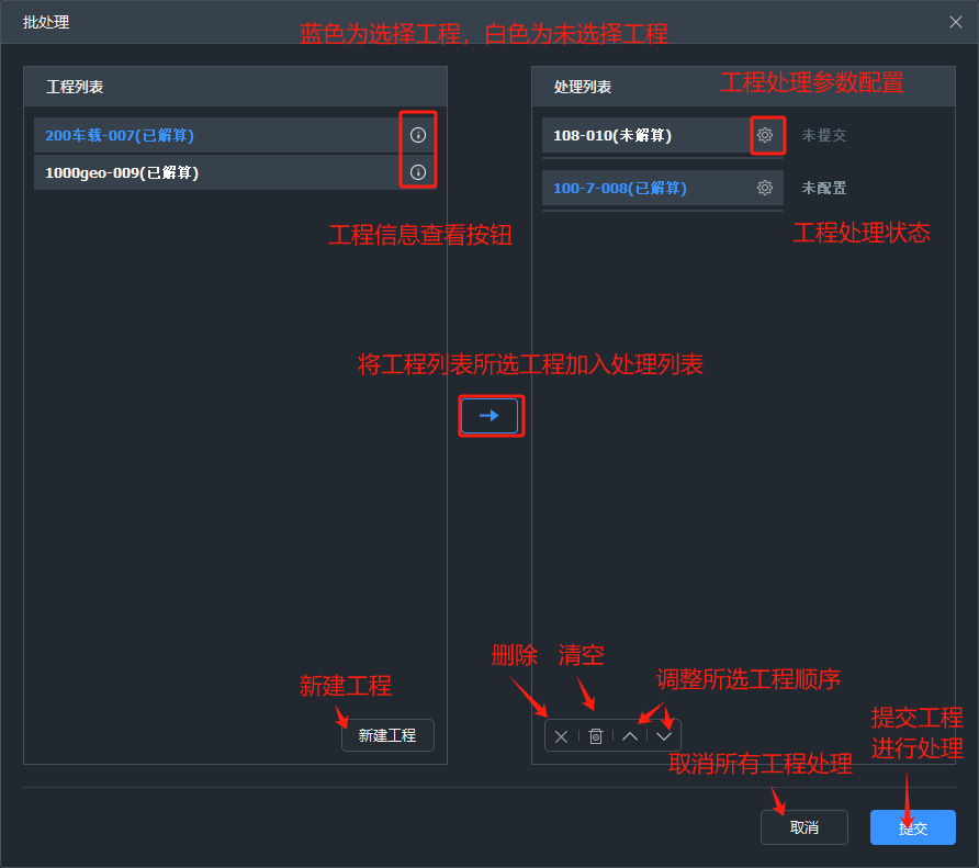 1.【工程列表】:当前软件中未加入处理列表中的其他工程,以及新建的工程;