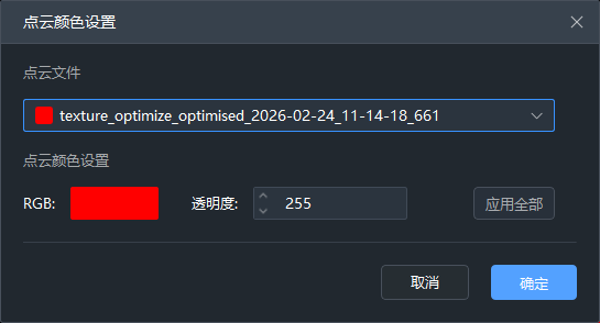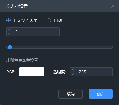 点云未赋色点颜色设置:如点云赋色时勾选输出未赋色点,该参数可设置赋色结果中的未赋色点显示颜色和透明度,设置的RGB颜色亦可在点云导出结果中起效。