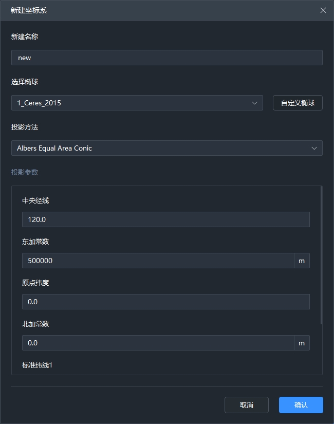 新建坐标系:输出新建坐标系名称、选择已有椭球或者新建自定义椭球、投影方式,以及投影方式对应参数设置。
