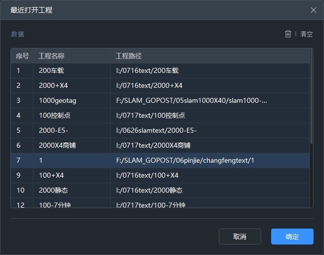 包含软件最近打开的工程,双击可直接打开选中工程;可通过右上角删除按钮删除选中工程记录,清空按钮删除列表中全部工程记录。