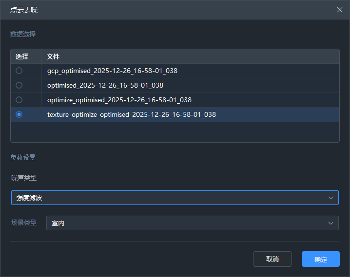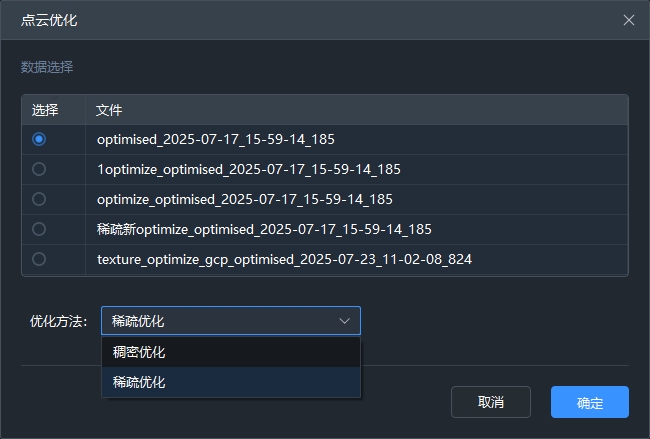 对所选择点云执行优化处理,可选择稀疏优化和稠密优化两种优化方式。