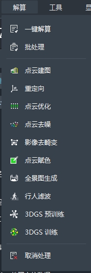 【解算】菜单中包括一键处理、批处理、点云建图、重定向、点云优化、点云去噪、影像去畸变、点云赋色、全景图生成、行人滤波、3DGS预训练、3DGS训练、取消处理。