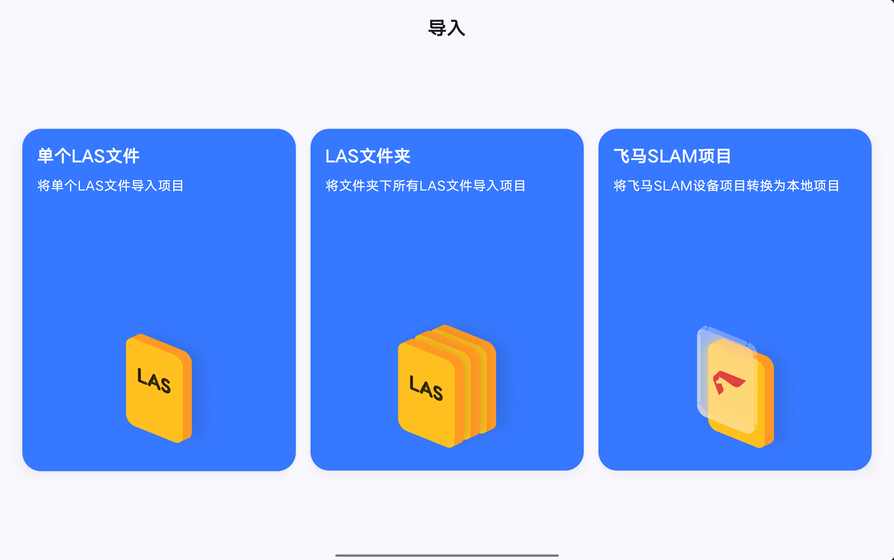 在软件起始页面点击“新建工程”按钮,软件切换至数据加载页面,目前软件支持从本机或外部存储设备中导入单个LAS数据、多个点云LAS数据、飞马SLAM设备项目数据创建测图工程。