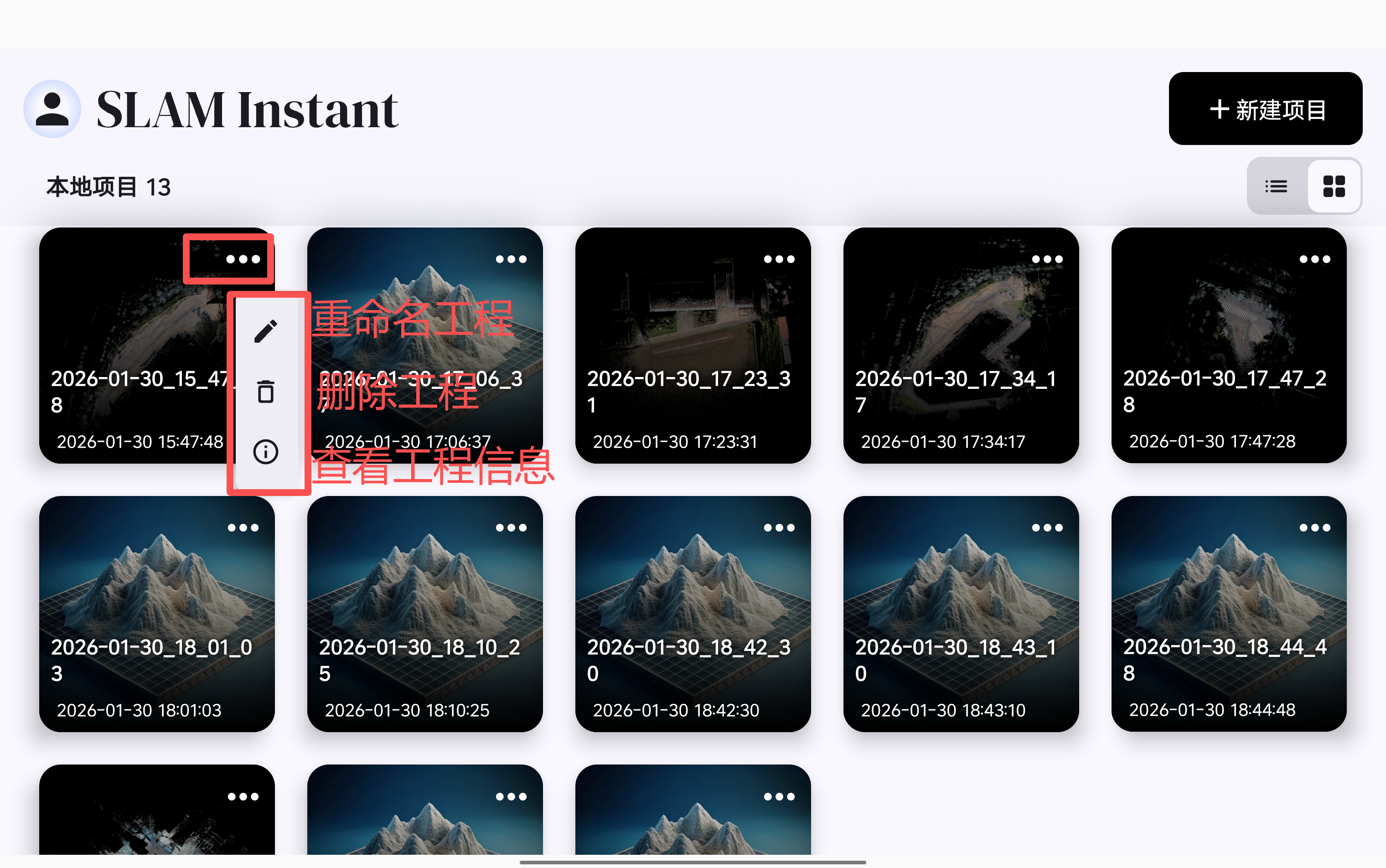 按钮就进行列表显示。如果需要对已创建工程进行删除、重命名、信息查看,可点击平铺显示模式下已创建工程的右上角
