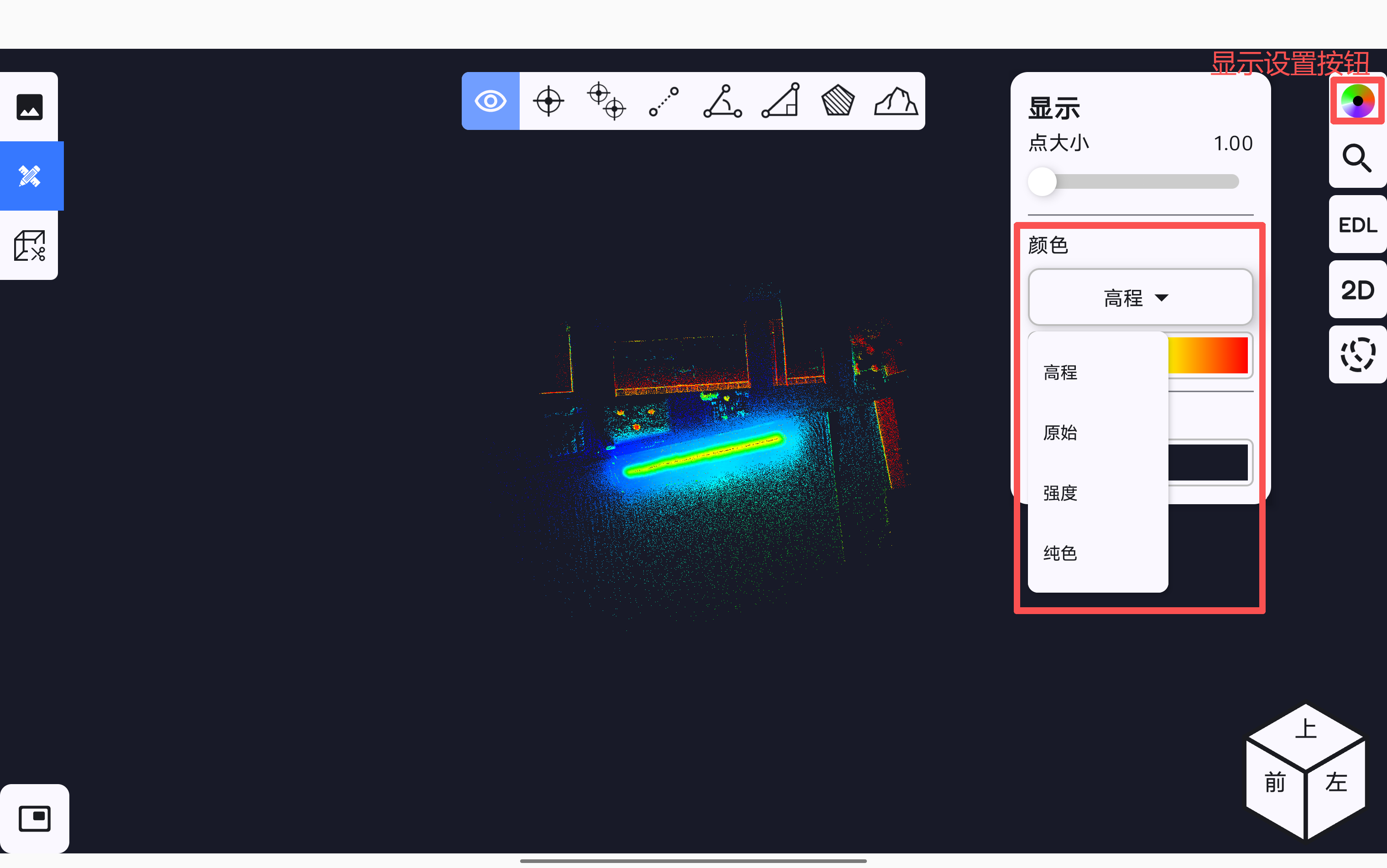 显示设置按钮,在弹出的显示页面中可根据需要调节点云显示的颜色。软件支持点云按高程、原始、强度、纯色模式进行显示。