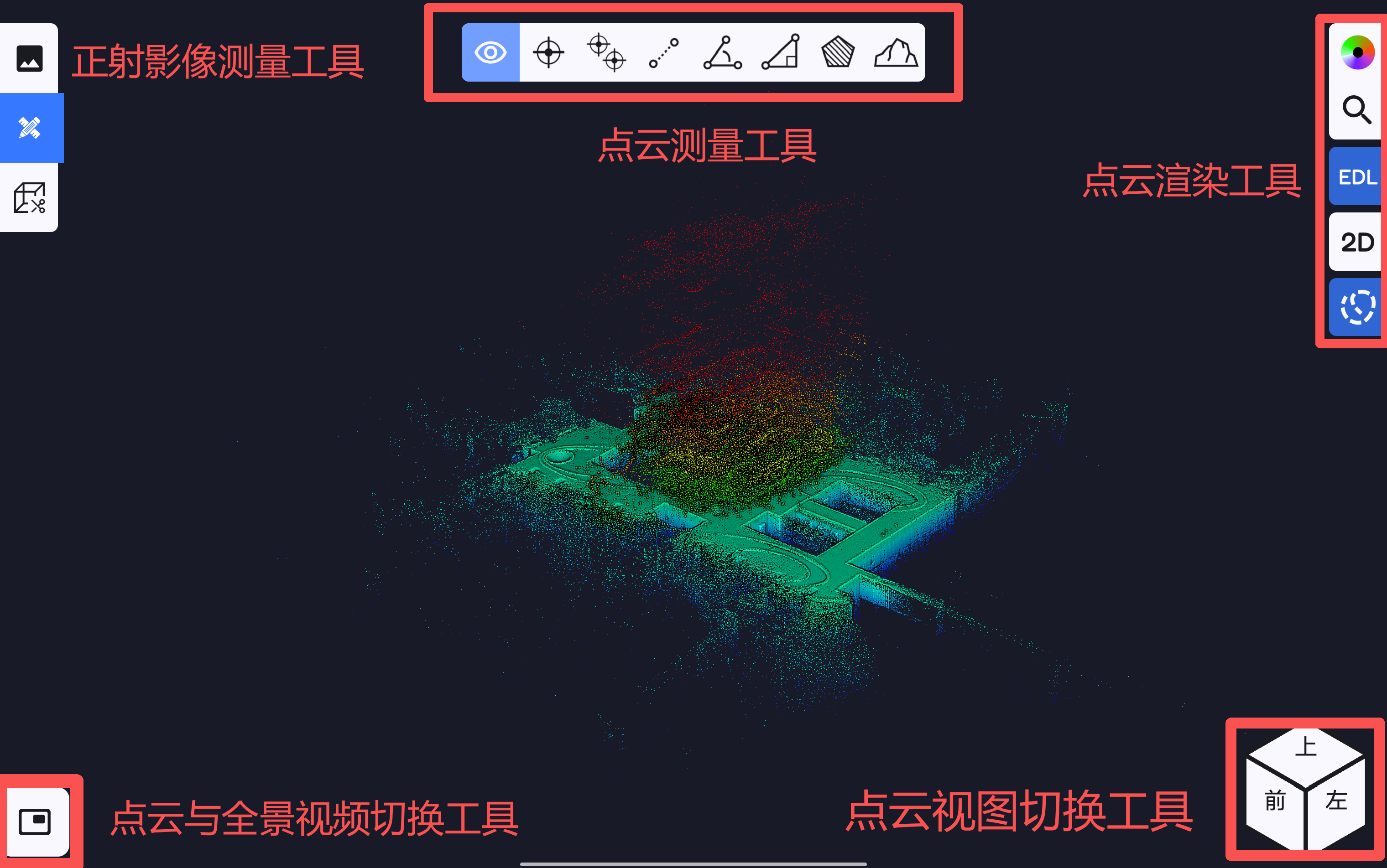 新建工程后或者打开已创建工程后,软件自动切换至测图页面,可在测图页面进行点云渲染模式调整、点云视图切换、全景视频预览、点云剖面裁切、点云基础测量、正射影像测量等。