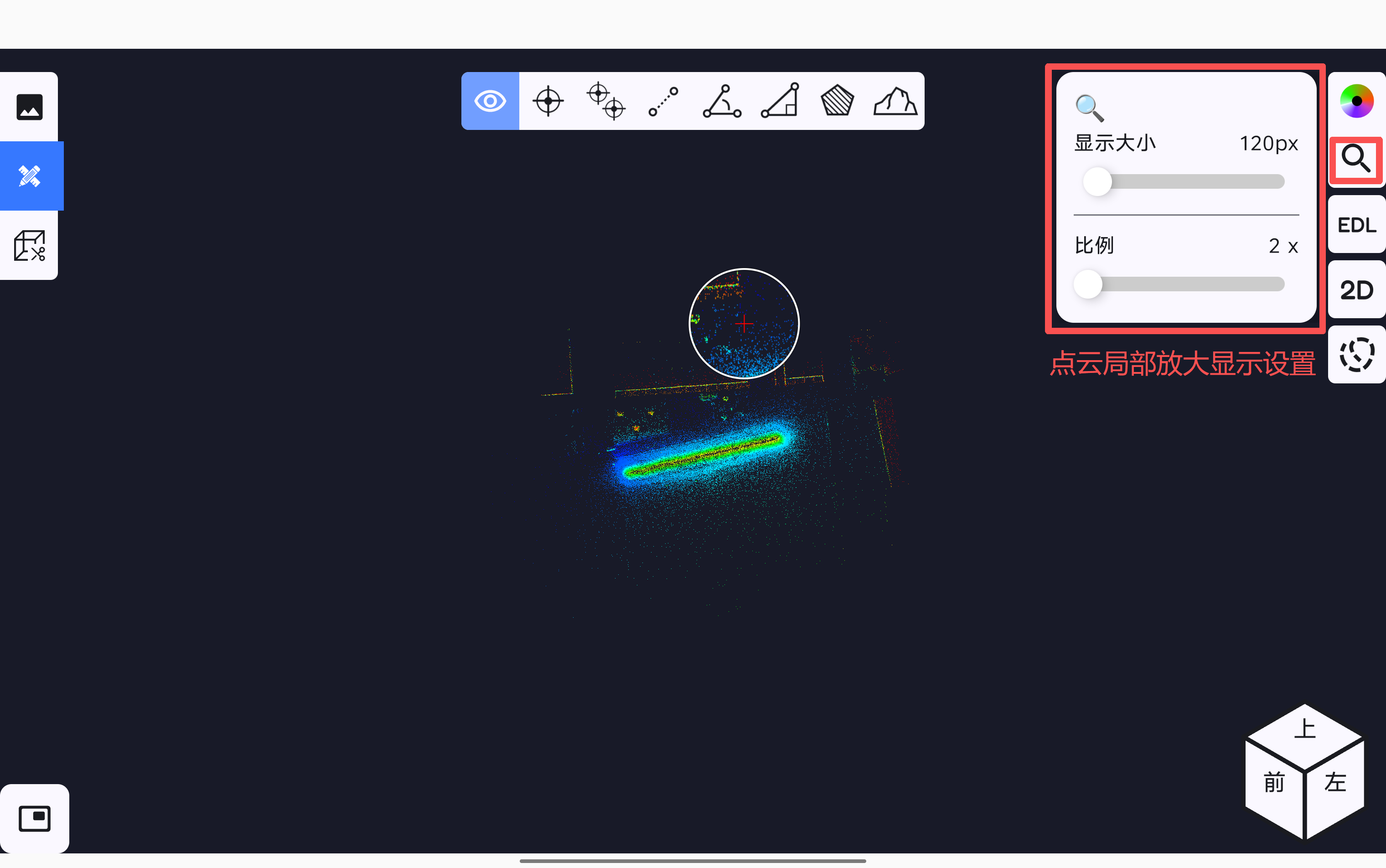 点云局部放大显示设置按钮,在弹出的显示页面中可根据需要局部放大的显示大小和比例。其中显示大小代表放大镜显示的范围大小,显示大小设置的越大,放大镜显示的范围越大;比例代表放大镜中地物的放大倍数,比例设置的越大,放大镜中的地物显示的越大。
