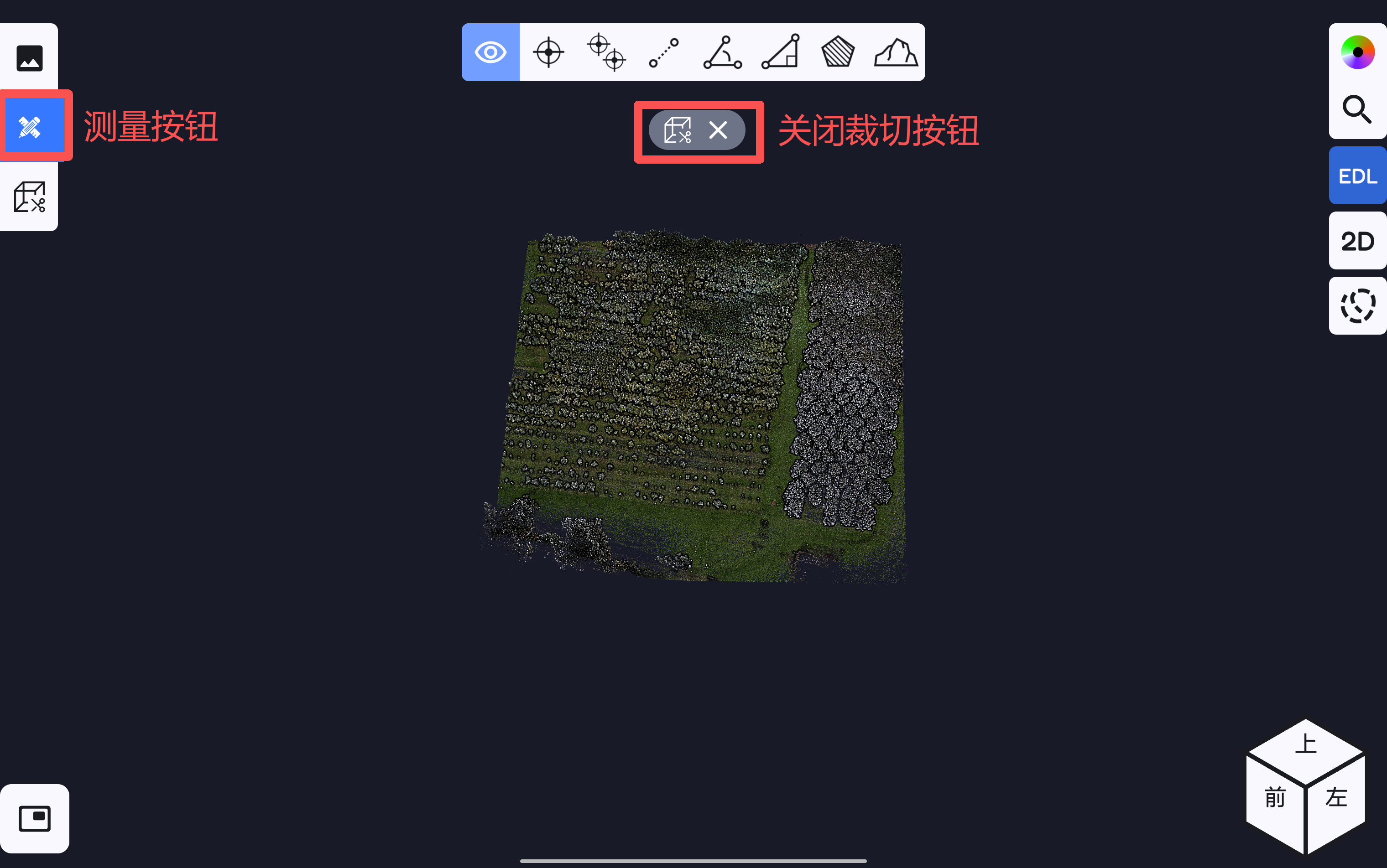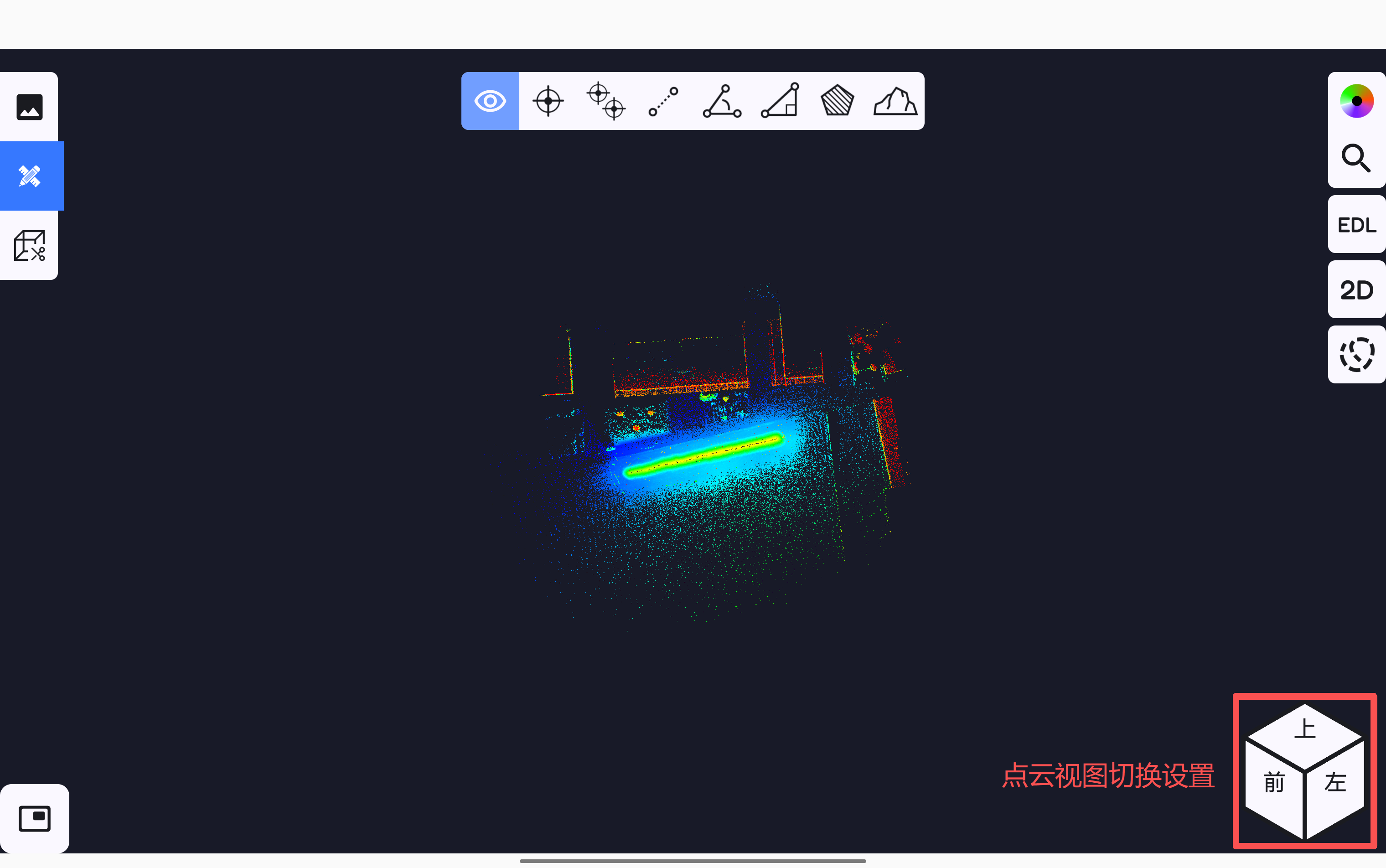 视图切换按钮,可按选中的视图对软件测图页面的点云数据进行视角切换;双击软件测图界面右下角的