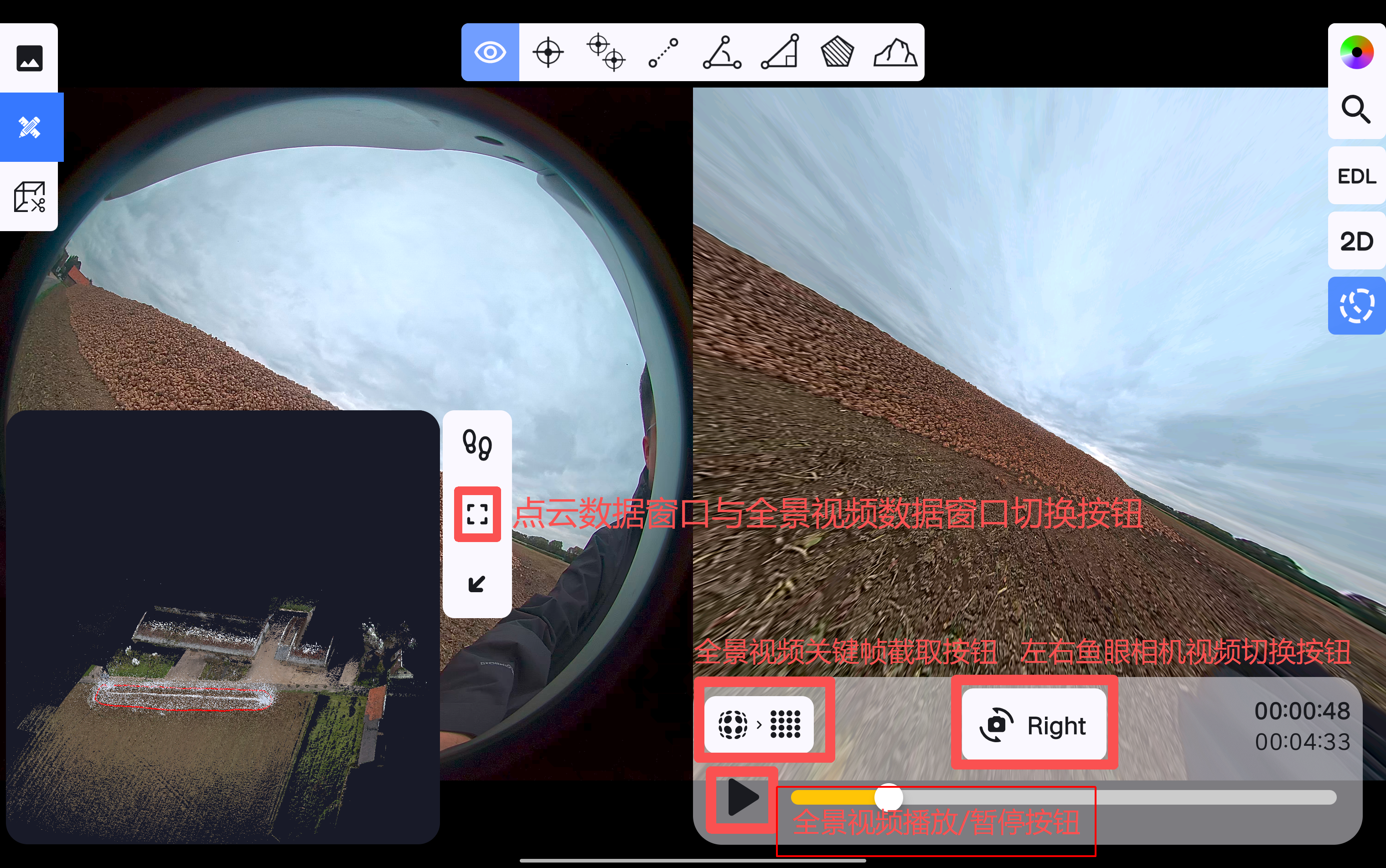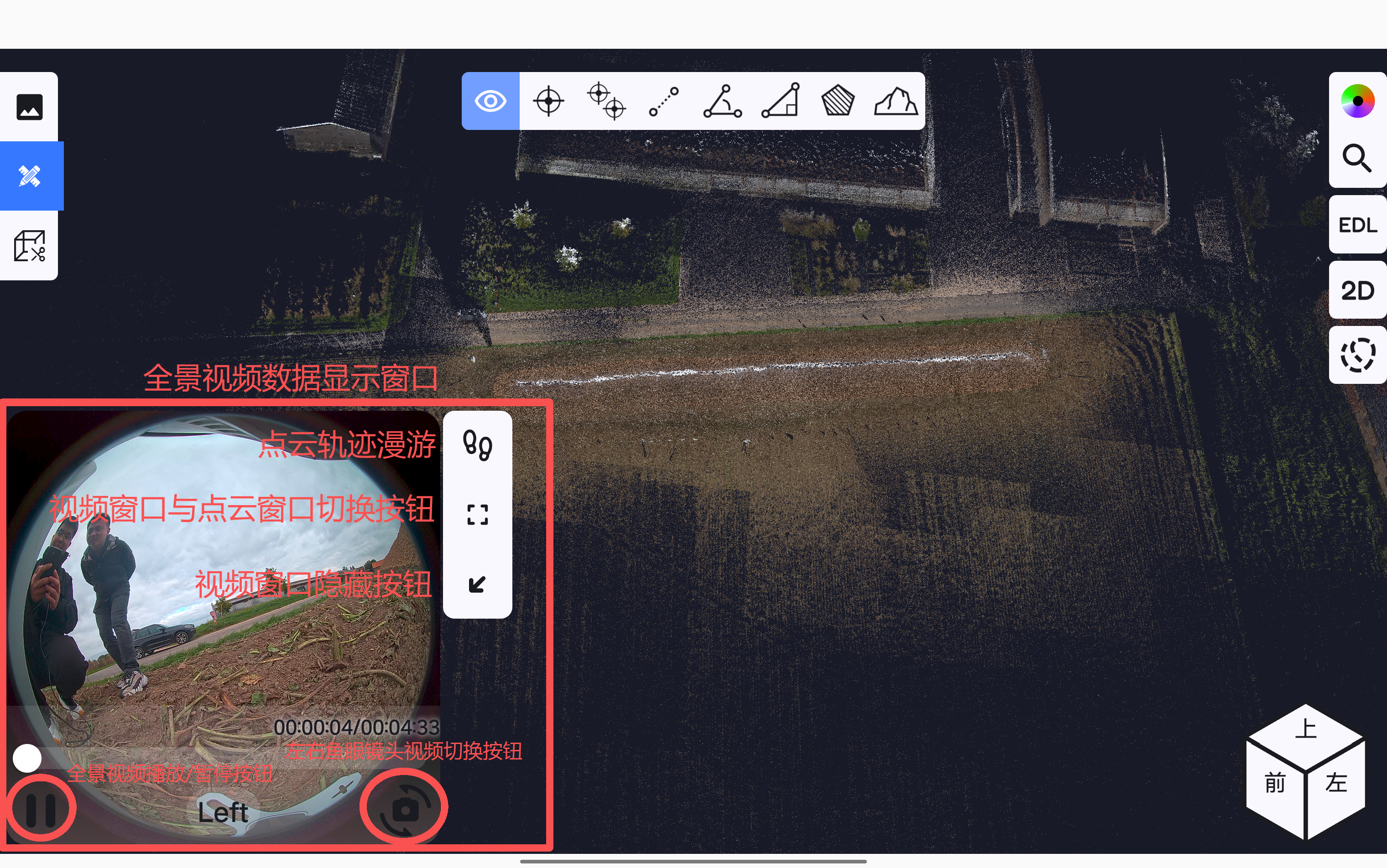 打开全景视频显示窗口后,可在窗口中进行视频播放或暂停、切换左右鱼眼相机获取的视频数据、将全景视频数据切换到全局窗口中。