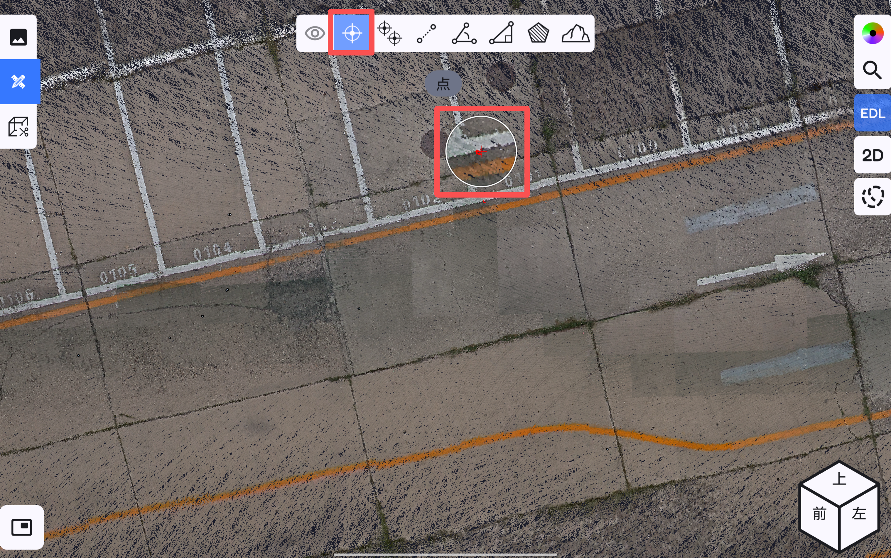 点击单点测量按钮,可在点云上随意任意选择一点进行点位坐标和属性查看。在选取点的过程中,若在屏幕上连续停留3秒以上,可触发局部放大功能,根据放大镜显示的区域,协助用户精确确定测量位置。