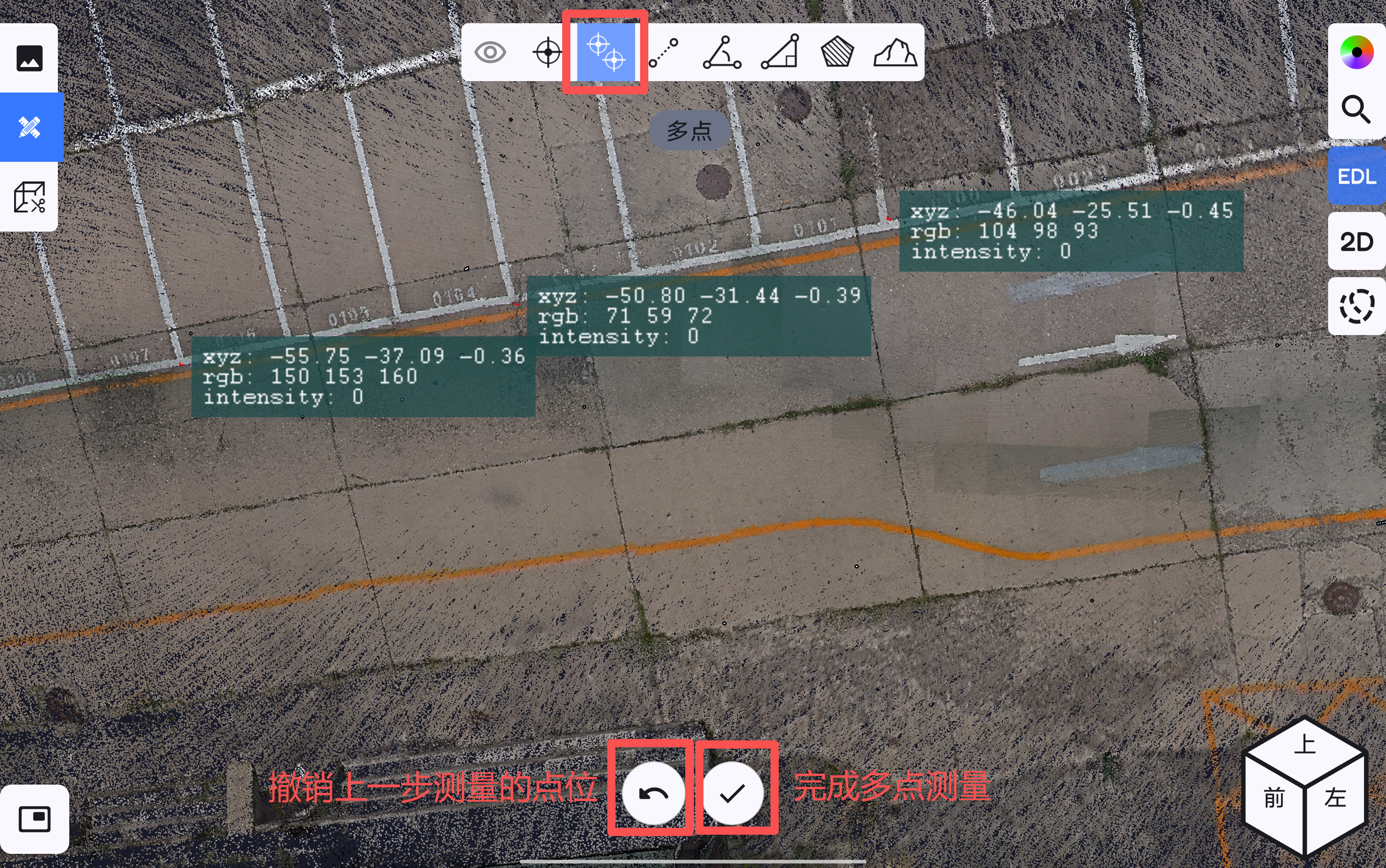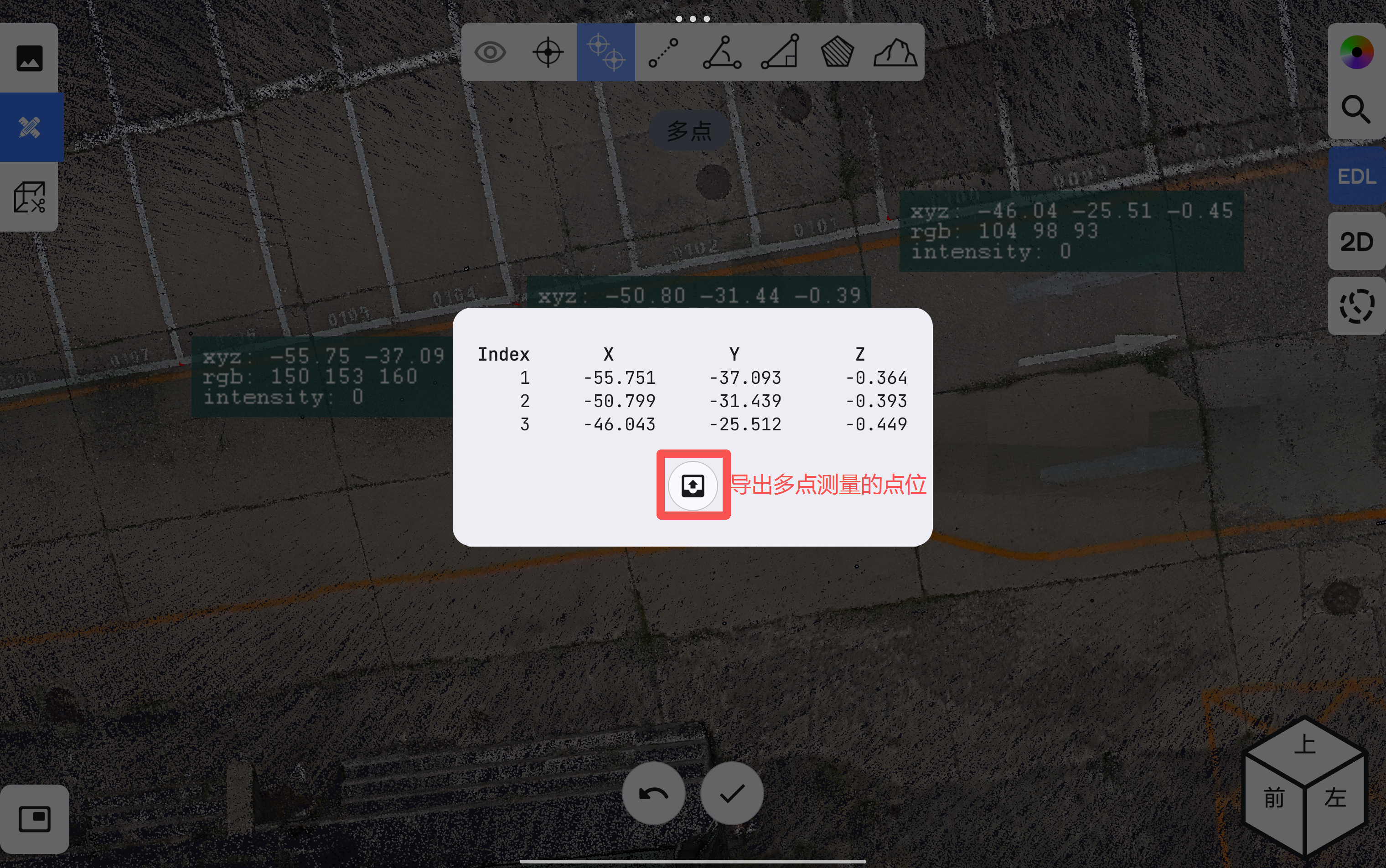 点击多点测量按钮,可在点云上随意任意选择多个点进行点位坐标和属性查看。在选取点的过程中,若在屏幕上连续停留3秒以上,可触发局部放大功能,根据放大镜显示的区域,协助用户精确确定测量位置。在选点测量过程中可撤销上一步选择的点位,完成多点测量功能后可将选择的点位坐标输出为CSV文件。