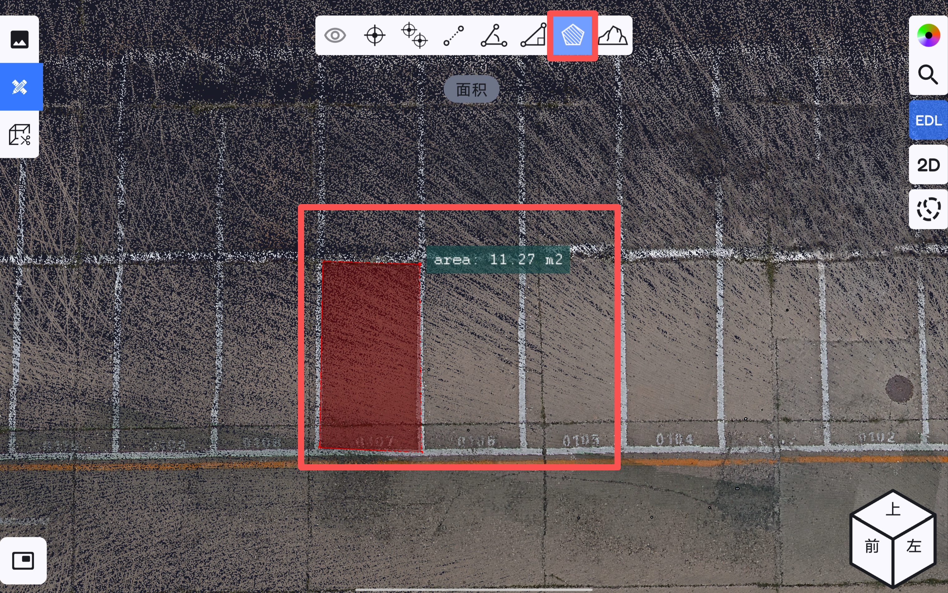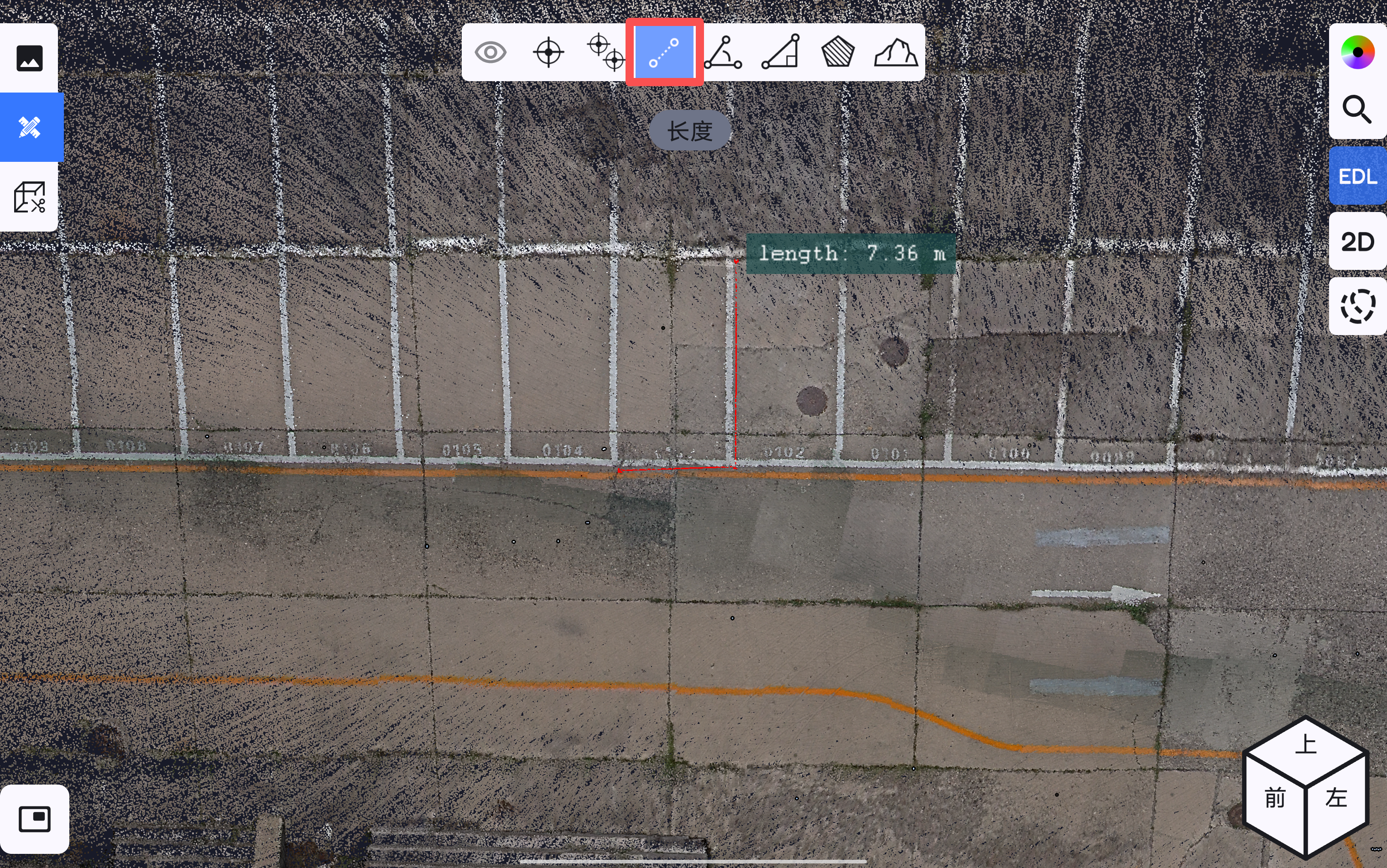 确定点云裁切范围后,点击测量按钮,可在裁切点云上进行单点测量、多点测量、距离测量、角度测量、空间三角距离测量、面积测量、土方测量。若在测量过程中,需要对整体点云进行测量,点击关闭裁切按钮即可将点云原始范围显示出来。
