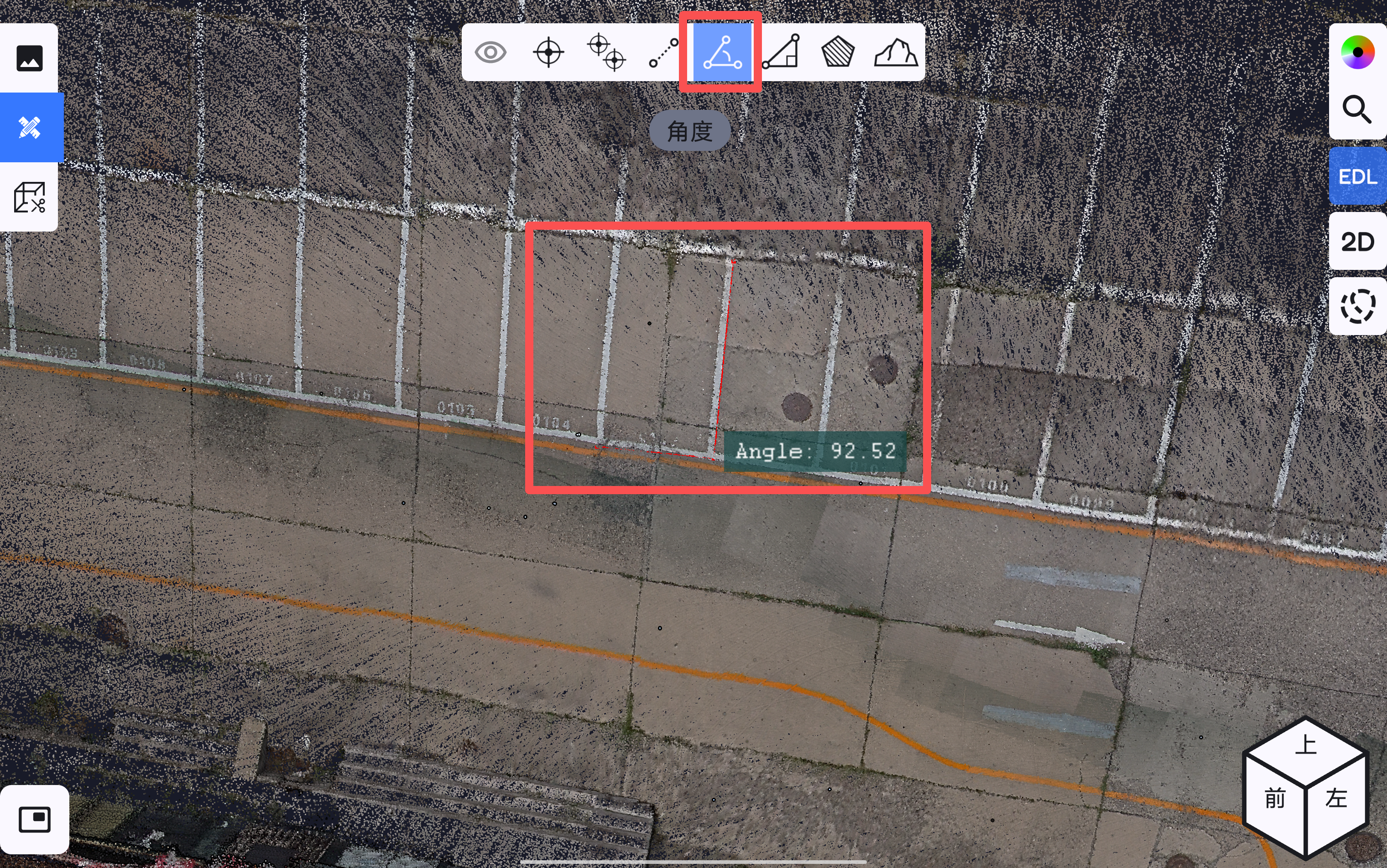 点击角度测量按钮,可在点云数据上任意选择三点进行角度测量。在选取点的过程中,若在屏幕上连续停留3秒以上,可触发局部放大功能,根据放大镜显示的区域,协助用户精确确定测量位置。