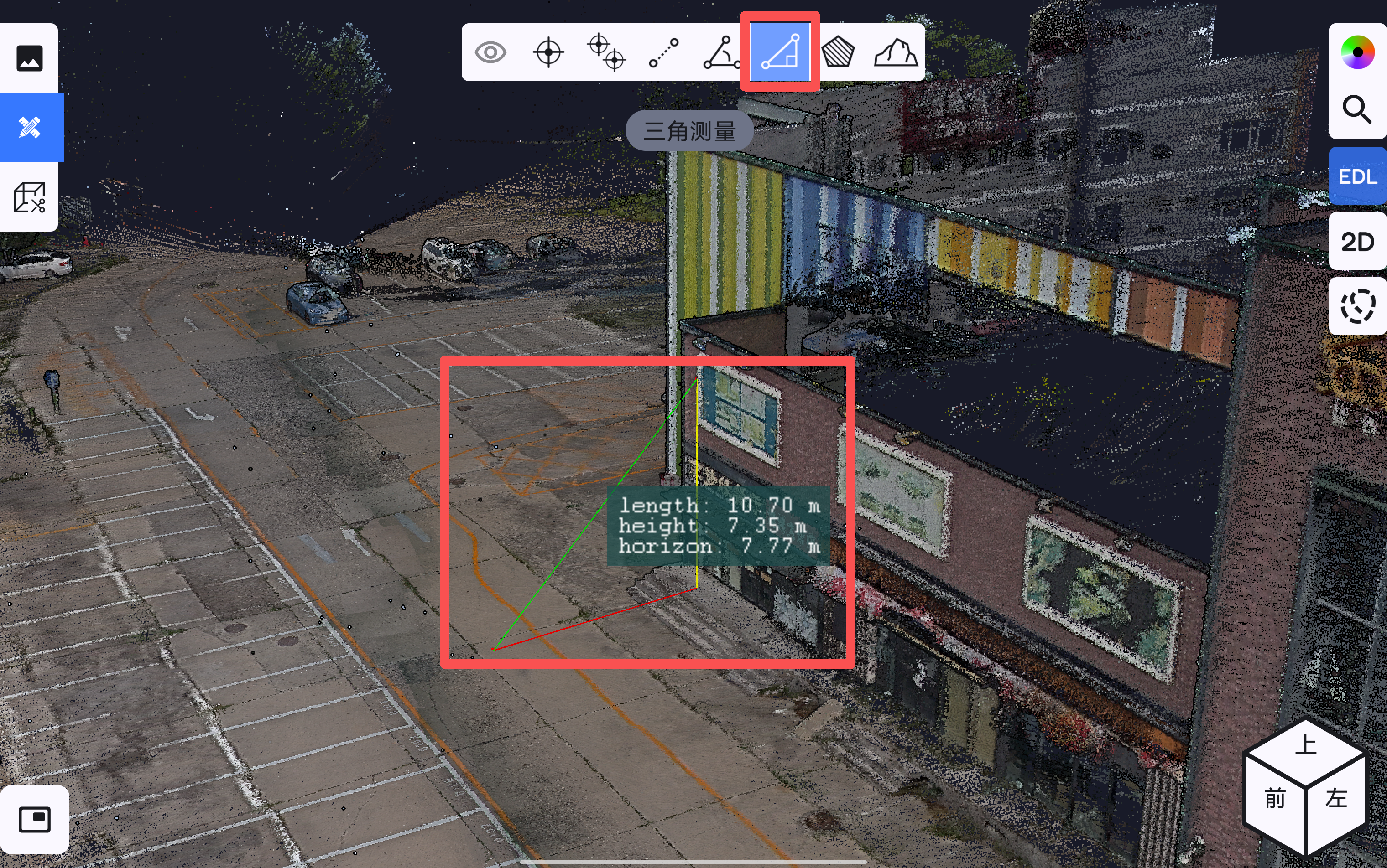 点击空间三角距离测量按钮,可在点云数据上任意选择两点进行空间三角距离测量。在选取点的过程中,若在屏幕上连续停留3秒以上,可触发局部放大功能,根据放大镜显示的区域,协助用户精确确定测量位置。