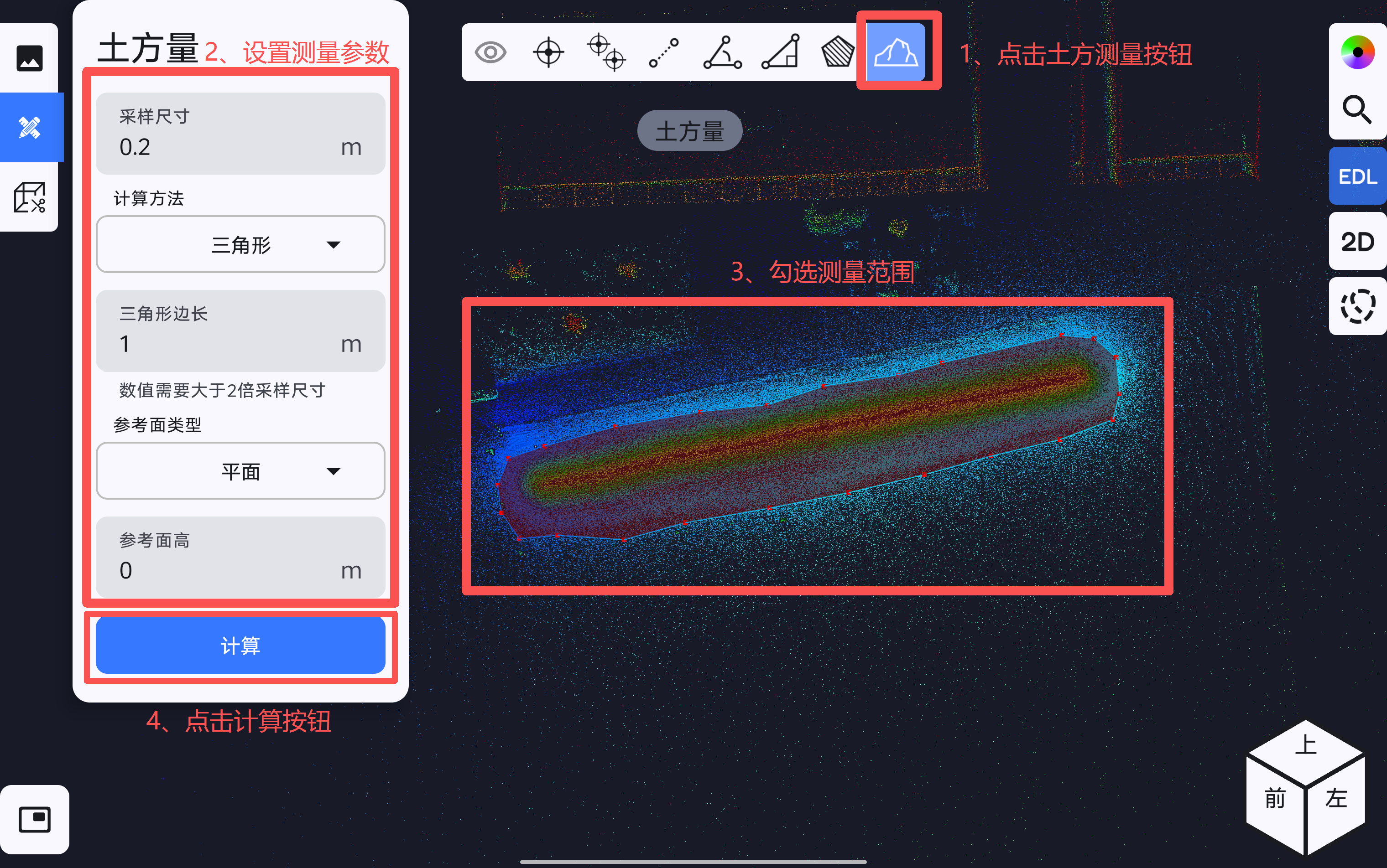 点击土方测量按钮,在土方量参数设置页面,设置采样尺寸、计算方法、格网边长或三角形边长、参考面类型;完成参数设置后,在点云数据上勾选土方测量范围,在选取土方测量范围的过程中,若在屏幕上连续停留3秒以上,可触发局部放大功能,根据放大镜显示的区域,协助用户精确确定测量位置。完成测量范围选取后,点击计算完成土方测量,支持导出土方测量报告。
