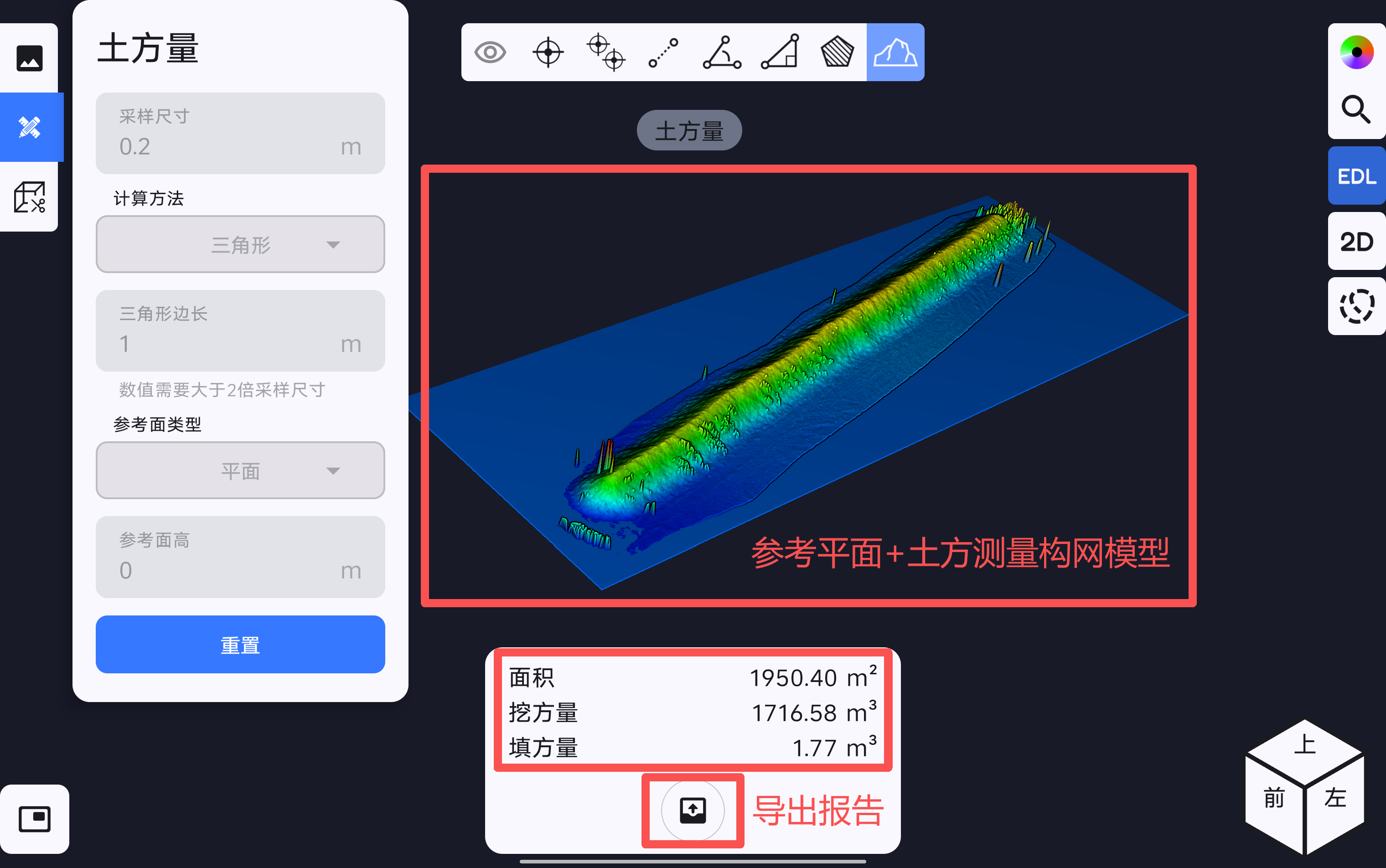若需要重新选取土方测量区域,点击重置,按照上述步骤重新计算土方量。