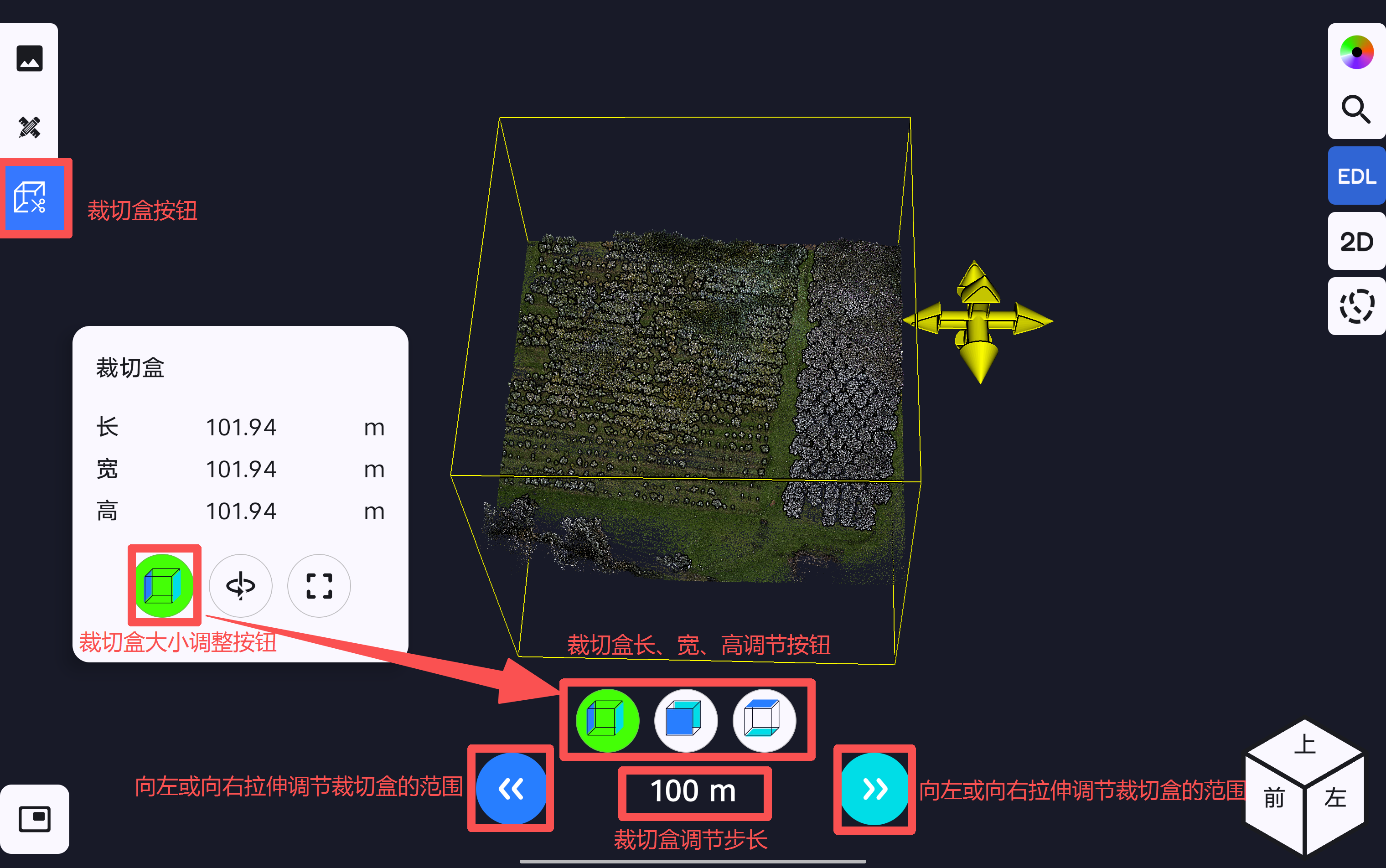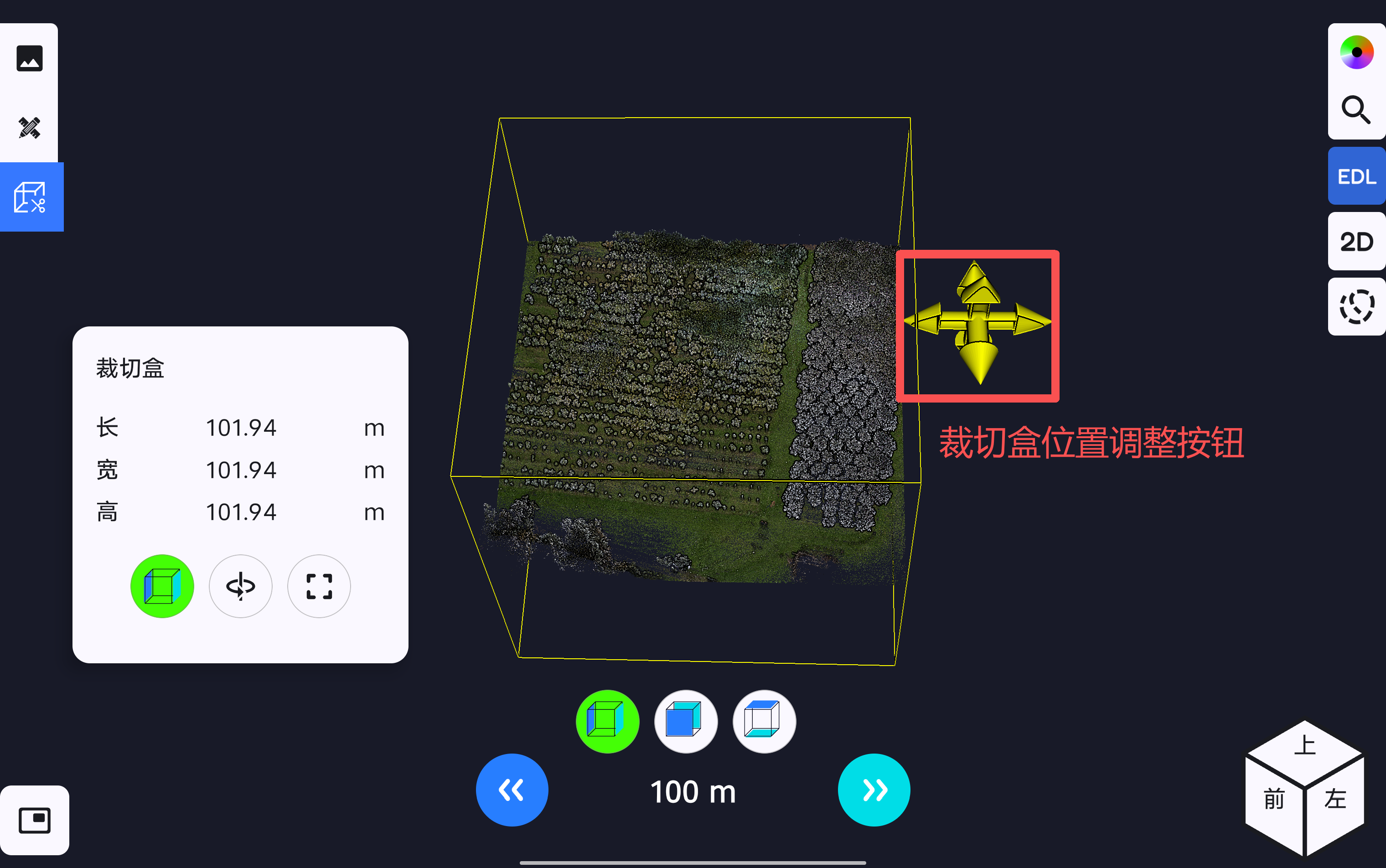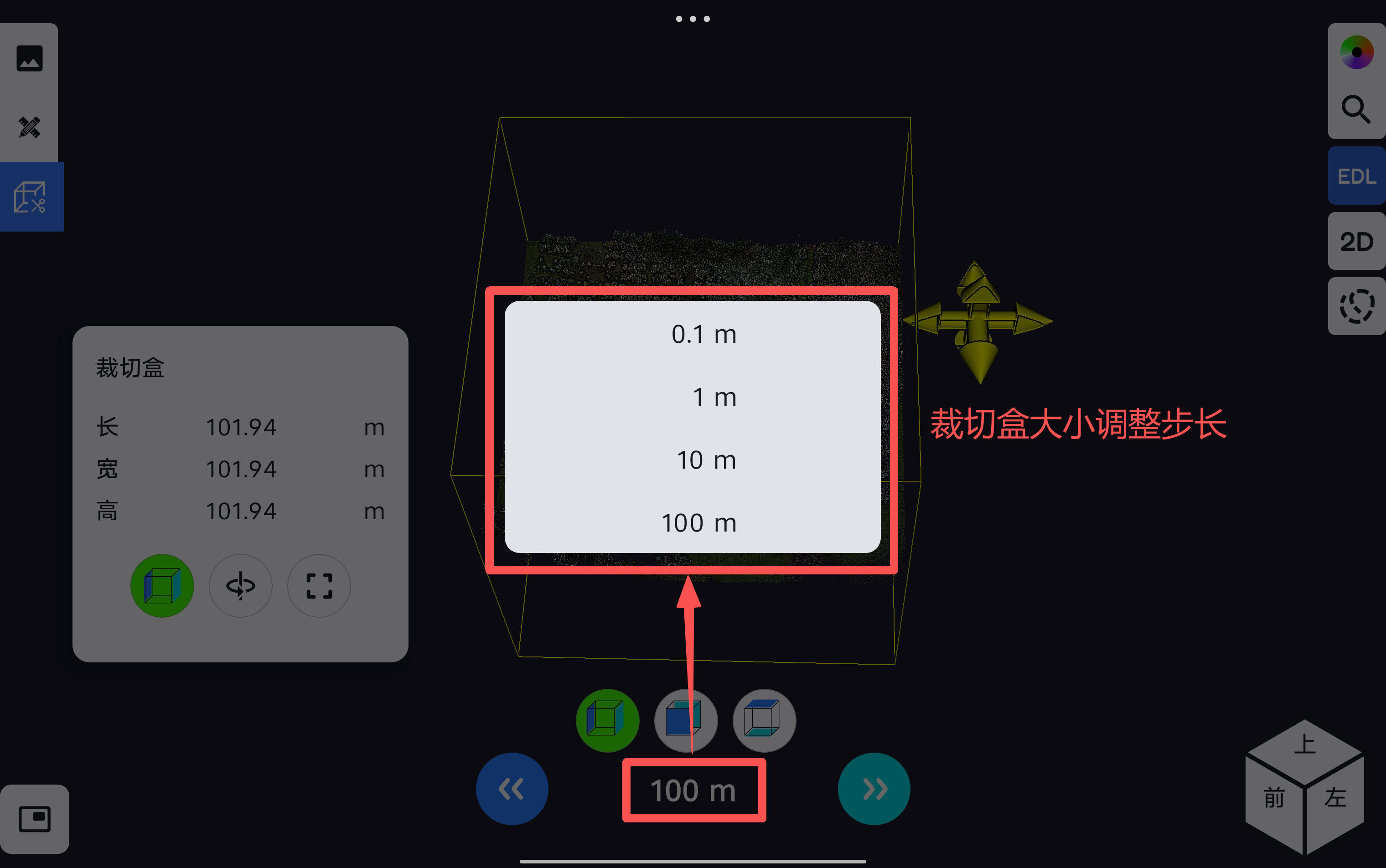 在裁切盒页面点击包围盒大小调整按钮,可对应显示裁切盒的长、宽、高三个方向的调节按钮,对应通过左右拉伸按钮进行裁切盒大小调整。在进行拉伸过程中,会根据裁切盒调整步长对裁切盒的大小进行调整。软件支持设置裁切盒调整步长设置,步长可设置为0.1m、1m、10m、100m。