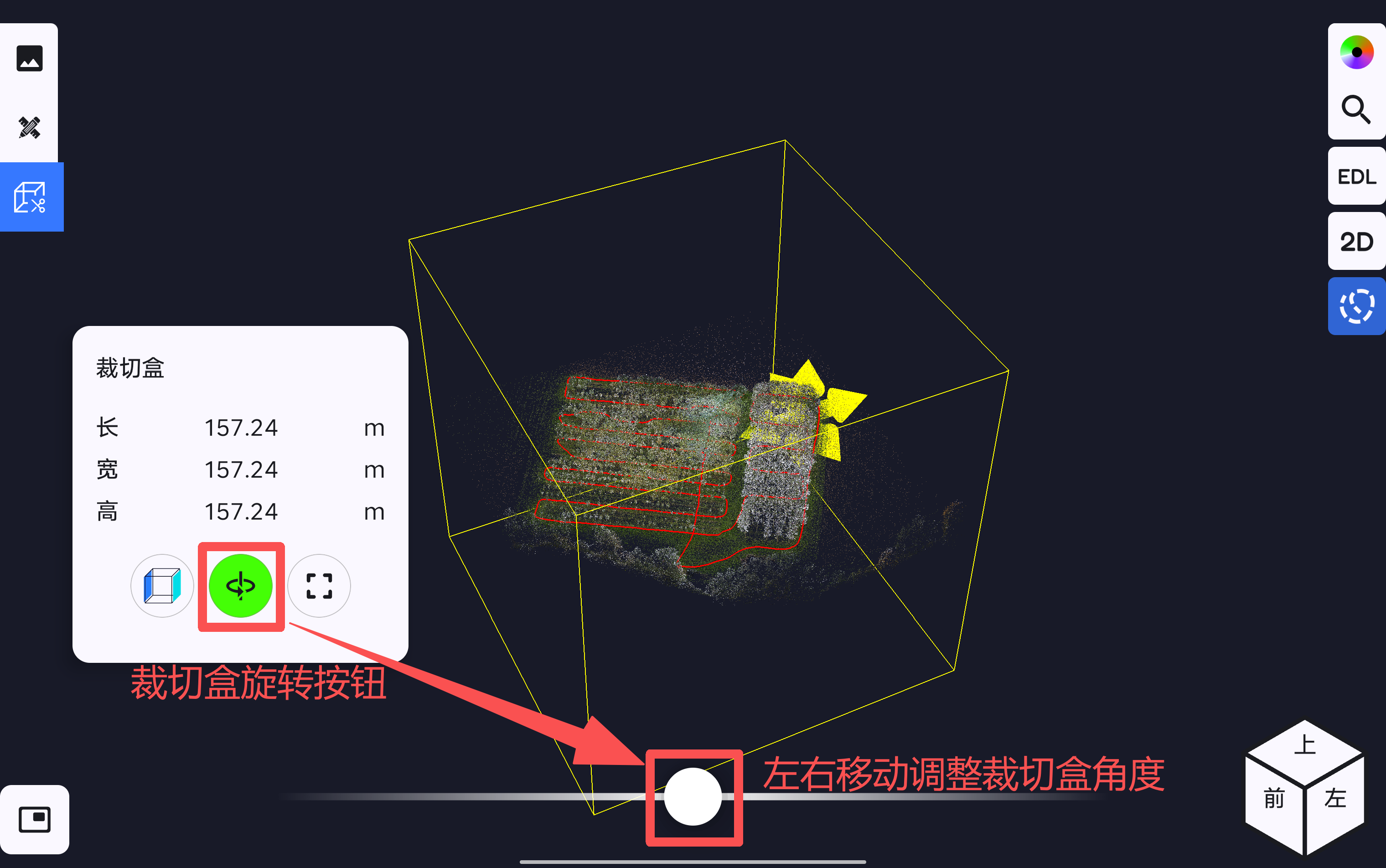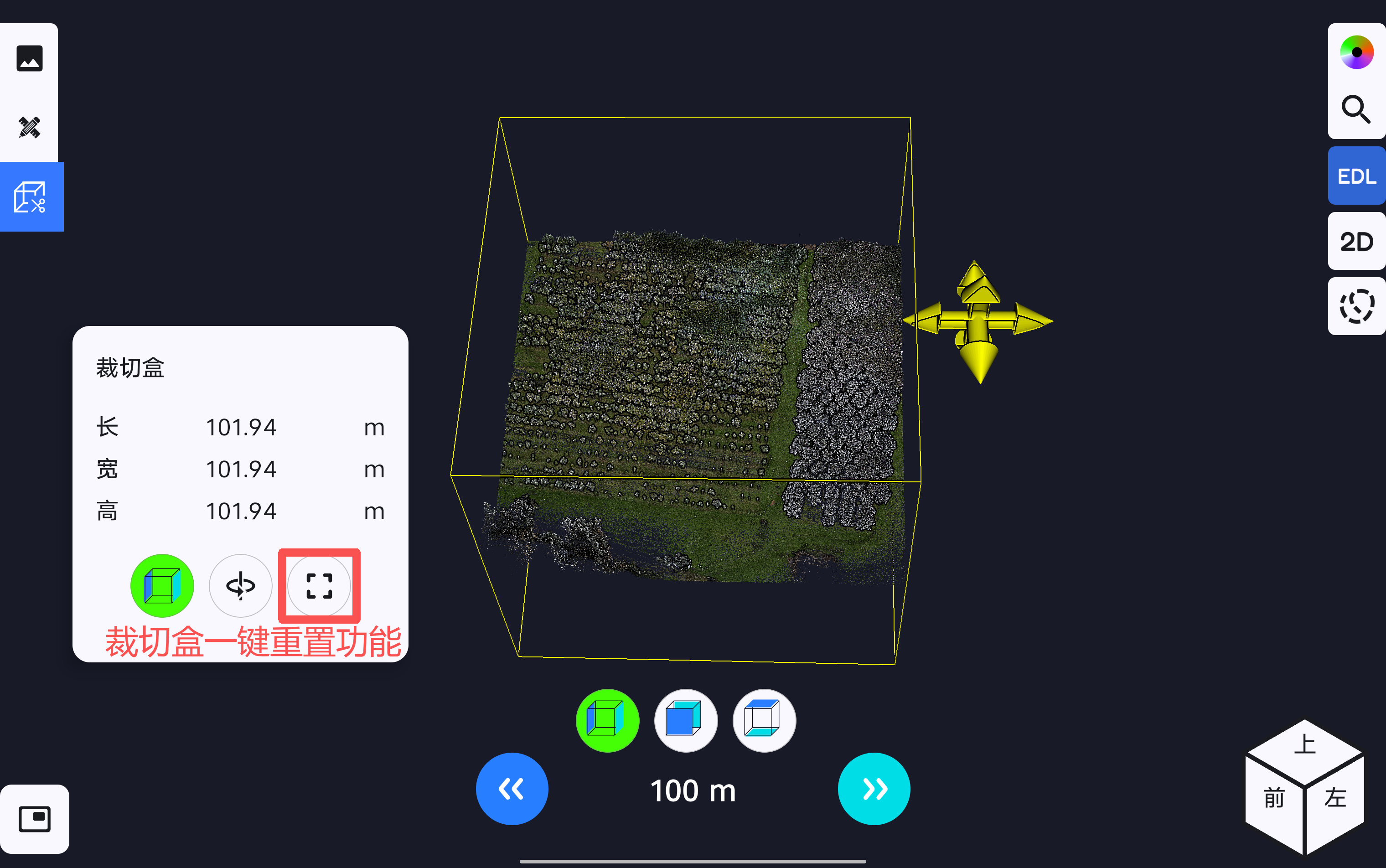 点击裁切盒一键重置按钮,裁切盒的大小恢复到原始状态,将点云数据的全部范围显示出来。