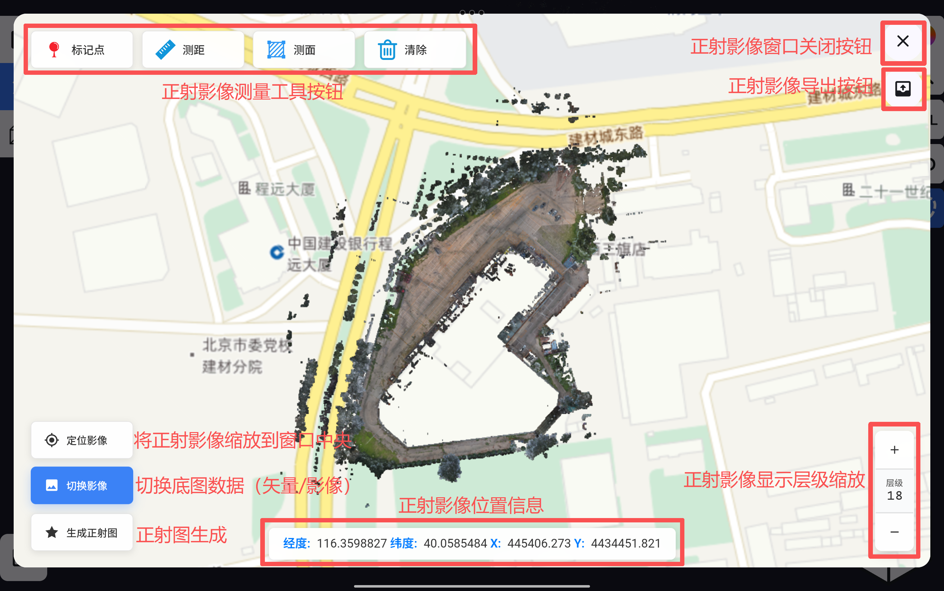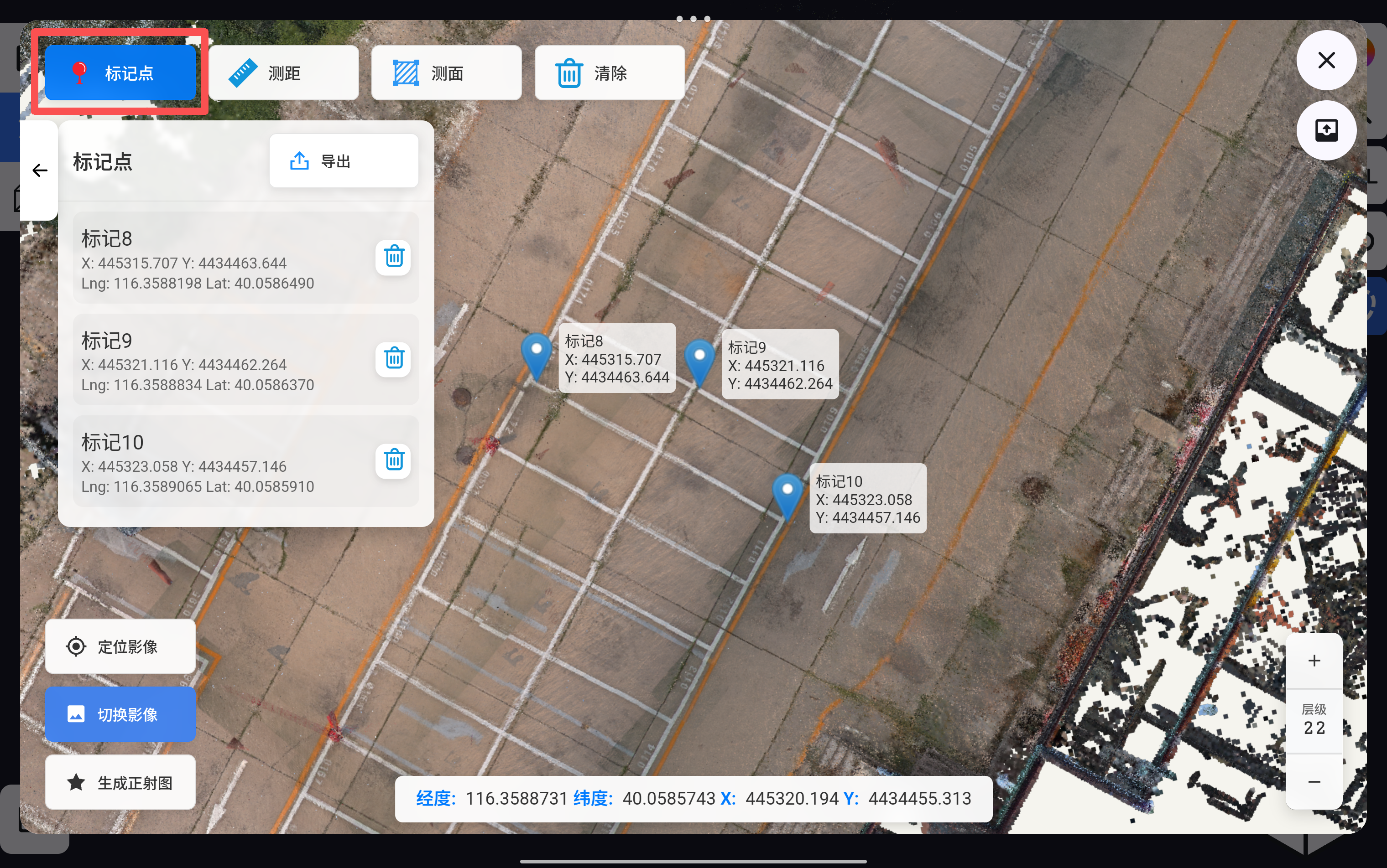 点击“标记点”功能,可在正射影像上进行点位测量,测量完成后,可将点位坐标导出为txt文件。