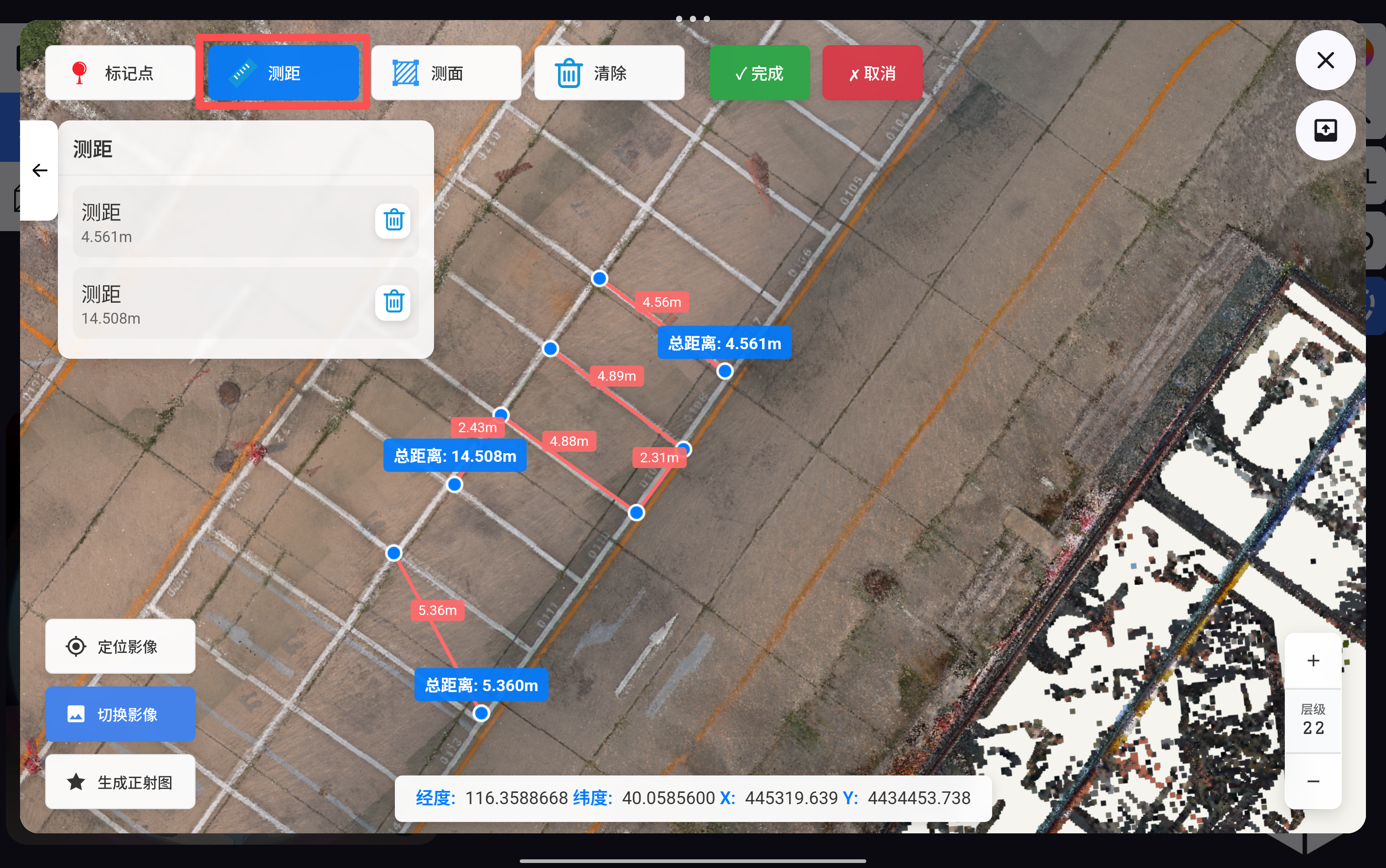点击“测距”按钮,可在正射影像上进行两点距离测量或多点距离测量,没完成一段距离选取,点击“完成”即可显示在测距列表中。如果在选取距离过程中需要取消当前选取测量位置,点击“取消”即可。