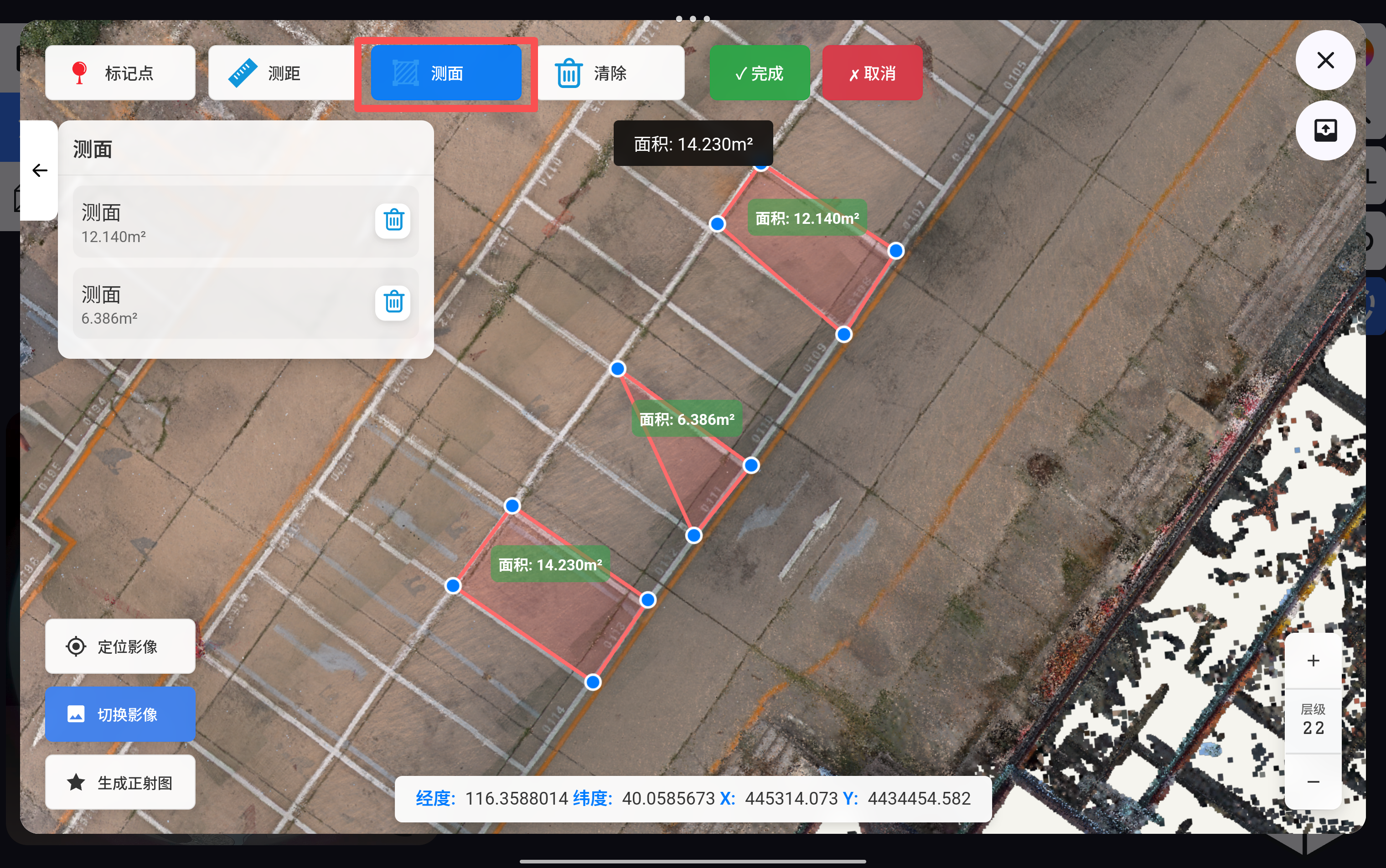 点击“测面”按钮,可在正射影像上进行面积测量,没完成一段距离选取,点击“完成”即可显示在测距列表中。如果在选取测量范围过程中需要取消当前选取范围,点击“取消”即可。