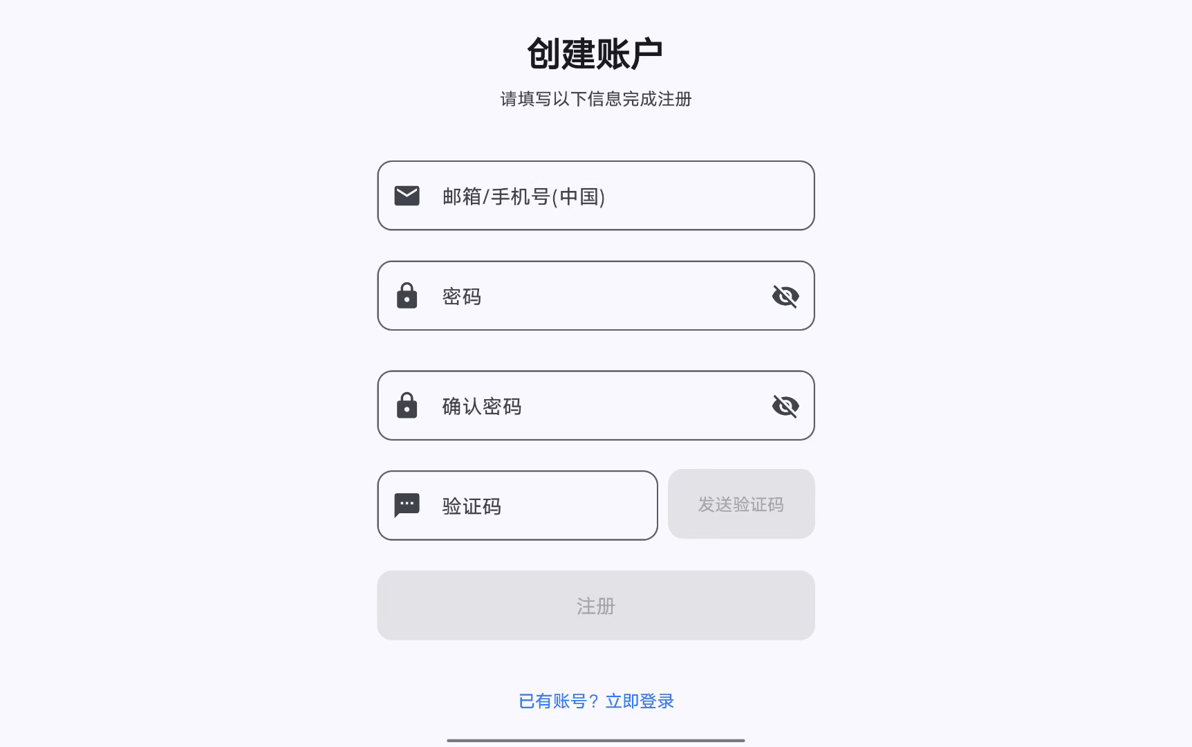 如果没有申请过飞马管家账号,可在用户登陆页面点击“还没有账号?立即注册”按钮,切换至账号注册页面进行账号注册。目前软件支持中国手机号和全球通用邮箱两种方式进行账号注册。