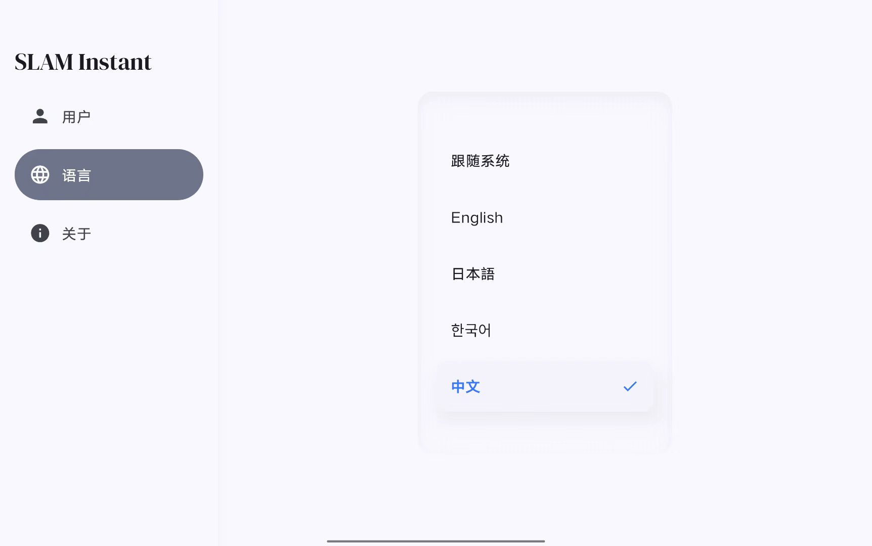 点击“语言”按钮,软件自动切换至语言设置页面,可根据需要进行语言设置,目前软件支持中文、英文、韩文、日文进行语言切换。